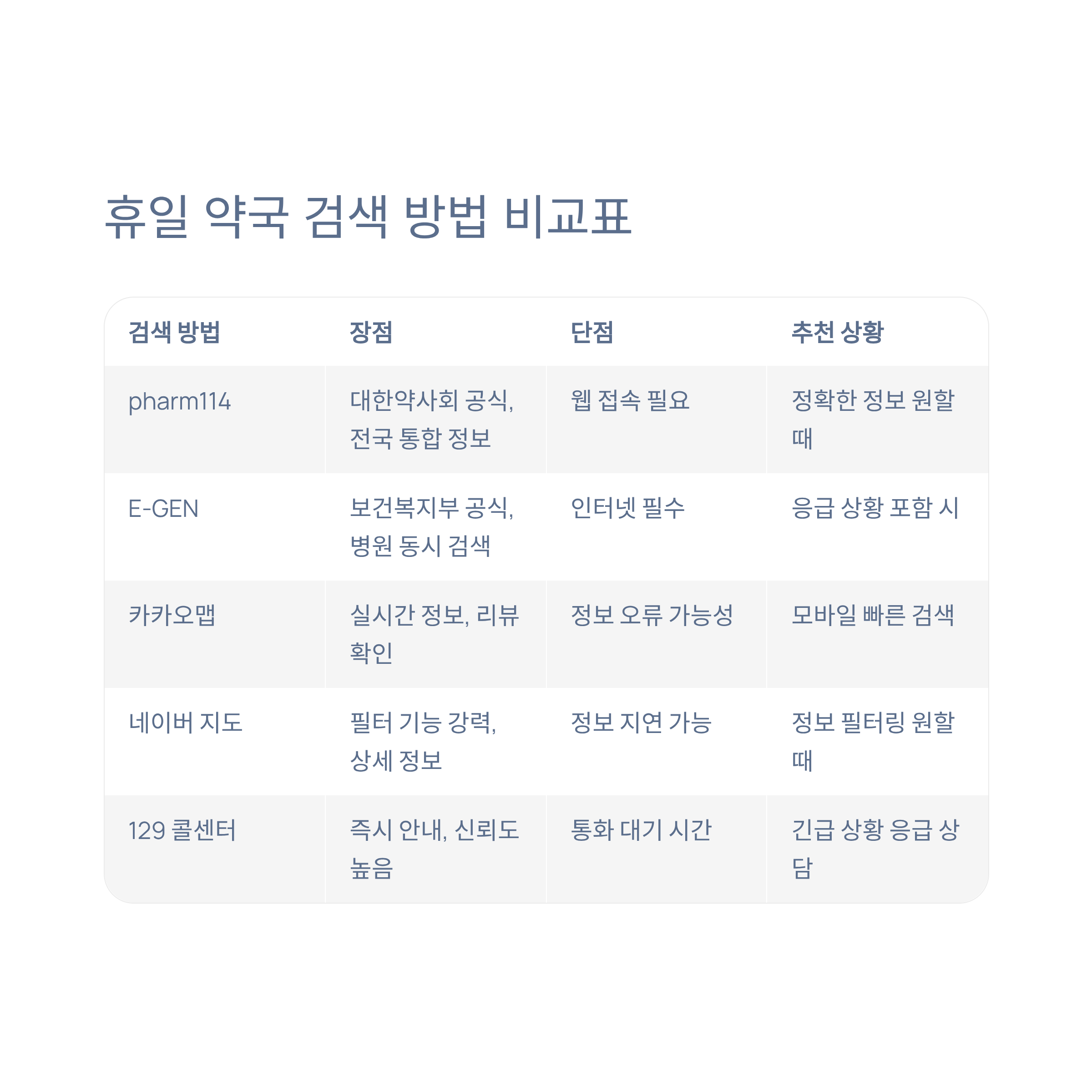 8️⃣ 📋 휴일 약국 검색 방법 비교표