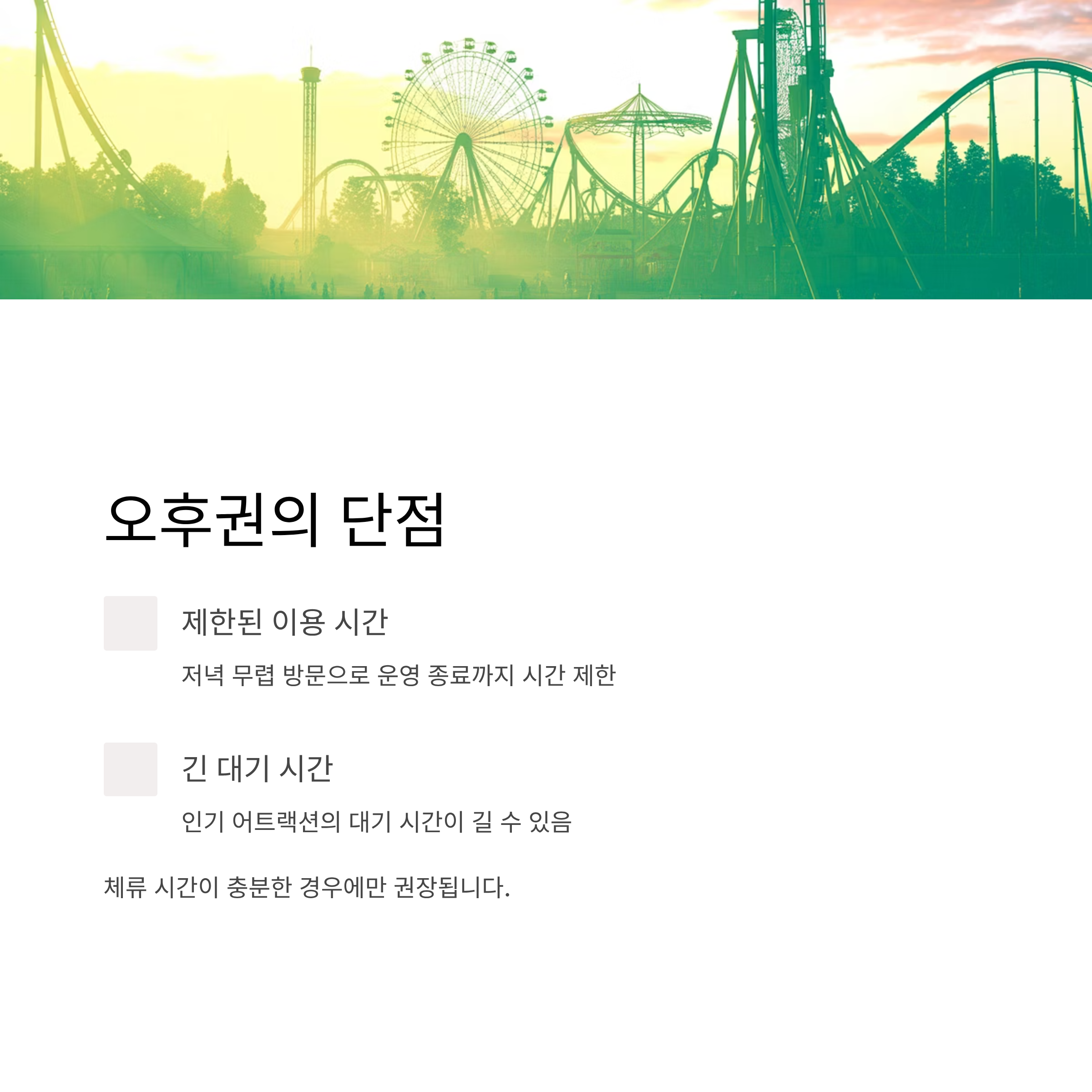 5순위는 오후권 활용입니다. 저녁 방문으로 시간이 충분하다면 38,000원의 오후권을 선택하는 것도 좋은 전략입니다.