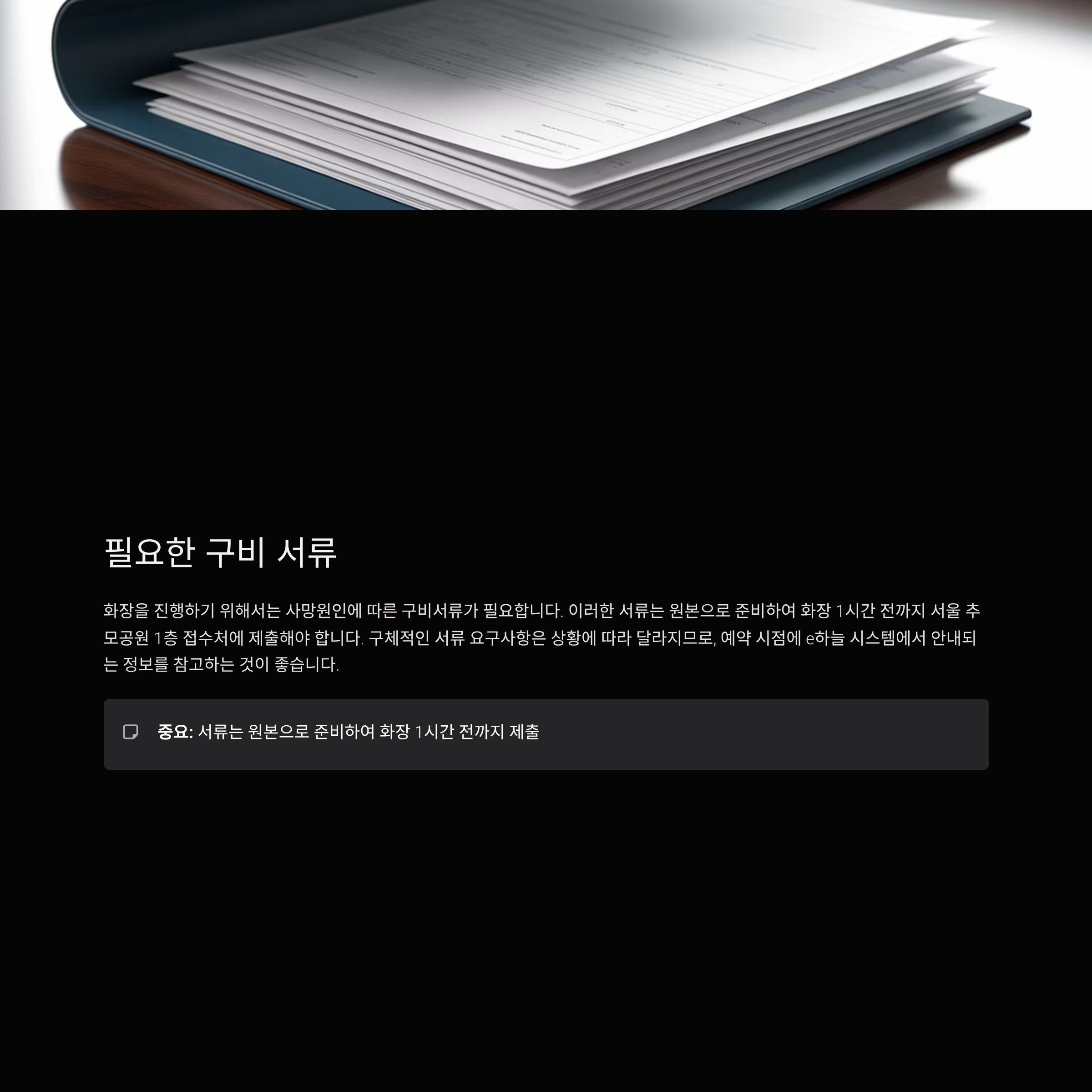 화장을 진행하기 위해서는 사망원인에 따른 구비서류가 필요합니다. 이러한 서류는 원본으로 준비하여 화장 1시간 전까지 서울 추모공원 1층 접수처에 제출해야 합니다. 구체적인 서류 요구사항은 상황에 따라 달라지므로, 예약 시점에 e하늘 시스템에서 안내되는 정보를 참고하는 것이 좋습니다.