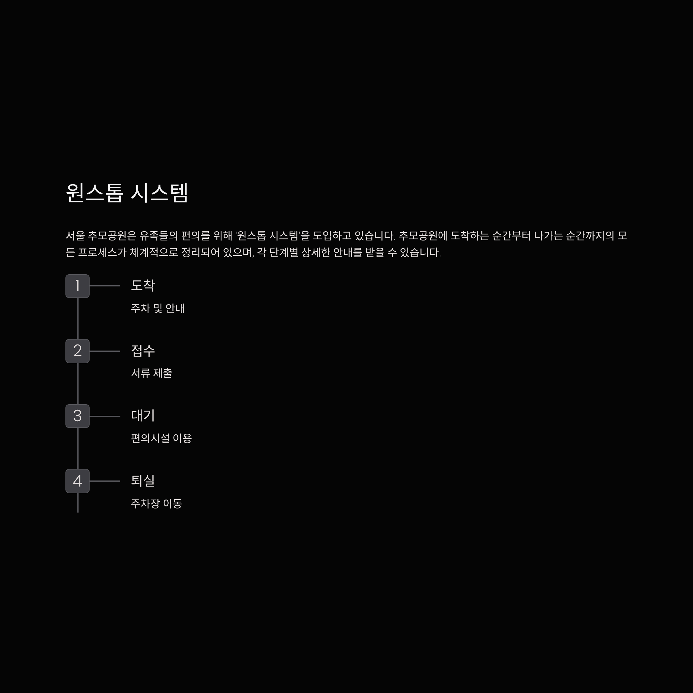 서울 추모공원은 유족들의 편의를 위해 '원스톱 시스템'을 도입하고 있습니다. 추모공원에 도착하는 순간부터 나가는 순간까지의 모든 프로세스가 체계적으로 정리되어 있으며, 각 단계별 상세한 안내를 받을 수 있습니다.