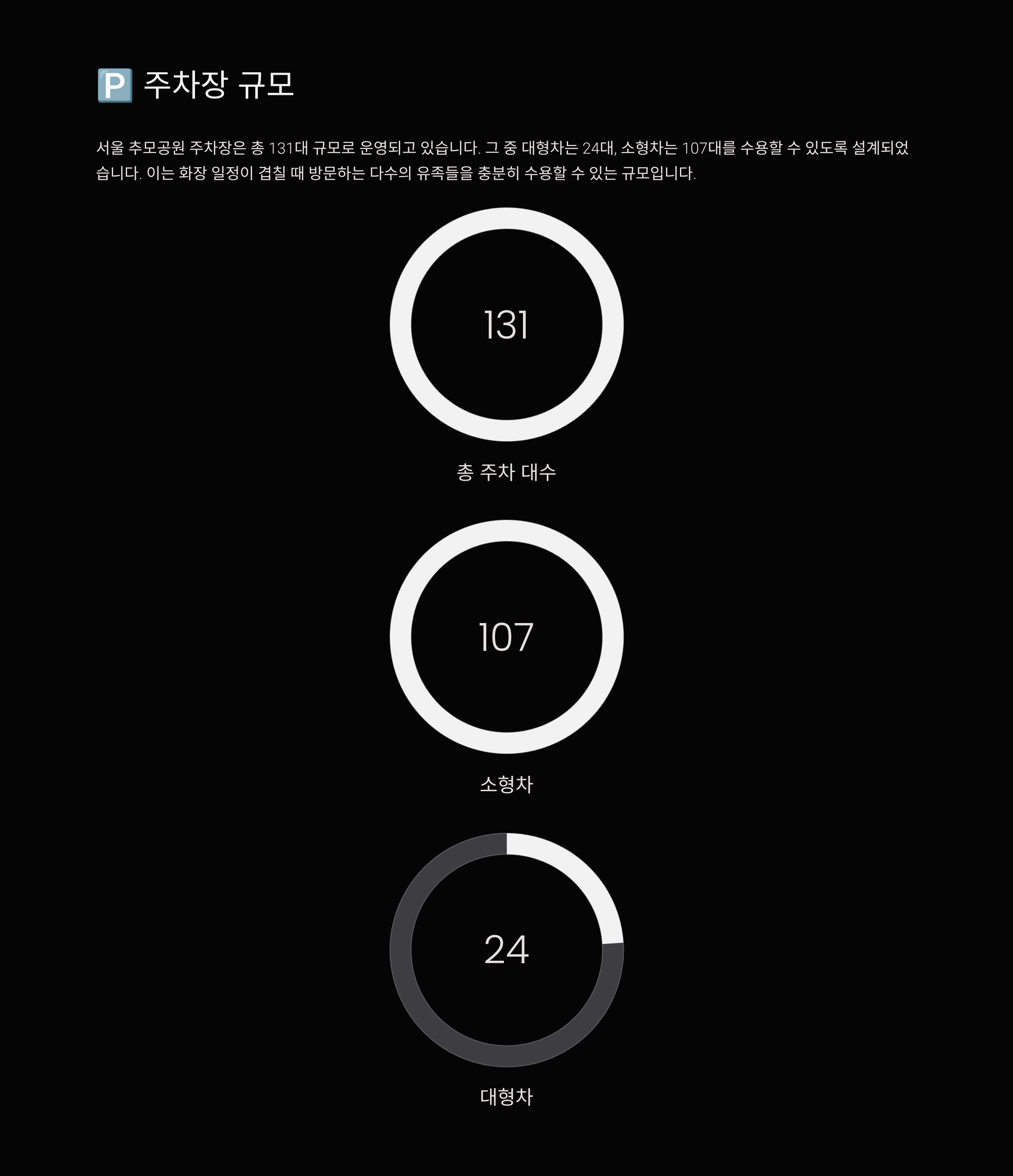 서울 추모공원 주차장은 총 131대 규모로 운영되고 있습니다. 그 중 대형차는 24대, 소형차는 107대를 수용할 수 있도록 설계되었습니다. 이는 화장 일정이 겹칠 때 방문하는 다수의 유족들을 충분히 수용할 수 있는 규모입니다.