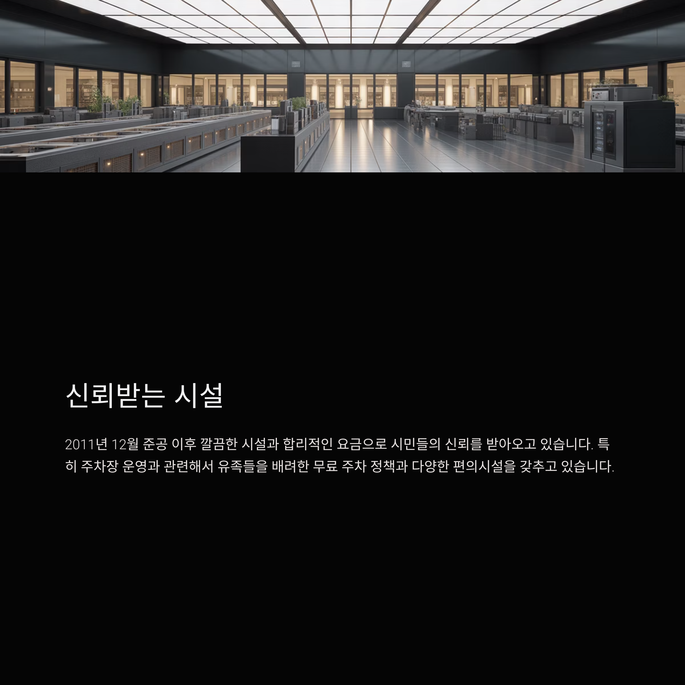 주차장은 지하 1층에 위치하고 있으며, 건물 내부와 엘리베이터로 직접 연결되어 있습니다. 유족들이 화장 종료 후 1층 수골홀을 거쳐 선큰 가든을 통해 지하주차장으로 이동할 수 있도록 설계되어 있어, 동선이 최적화되어 있습니다. 자동환기 시스템과 채광을 확보한 설계로 쾌적한 환경을 유지하고 있습니다.