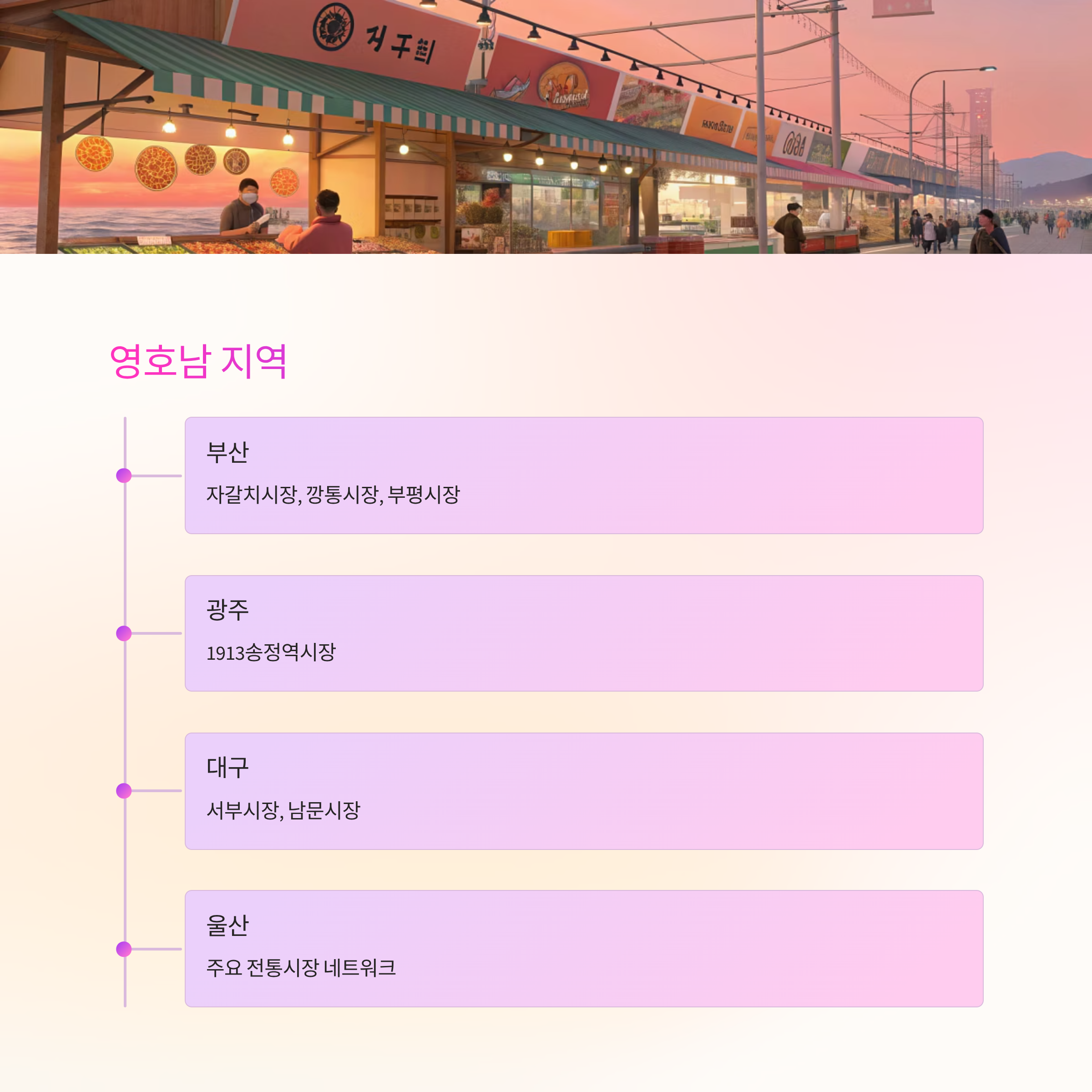 부산은 자갈치시장, 깡통시장, 부평시장이 유명하며, 광주는 1913송정역시장이 대표 전통시장입니다. 대구는 서부시장, 남문시장이 있으며, 울산도 주요 전통시장에서 광범위한 가맹점 네트워크를 구축하고 있습니다.