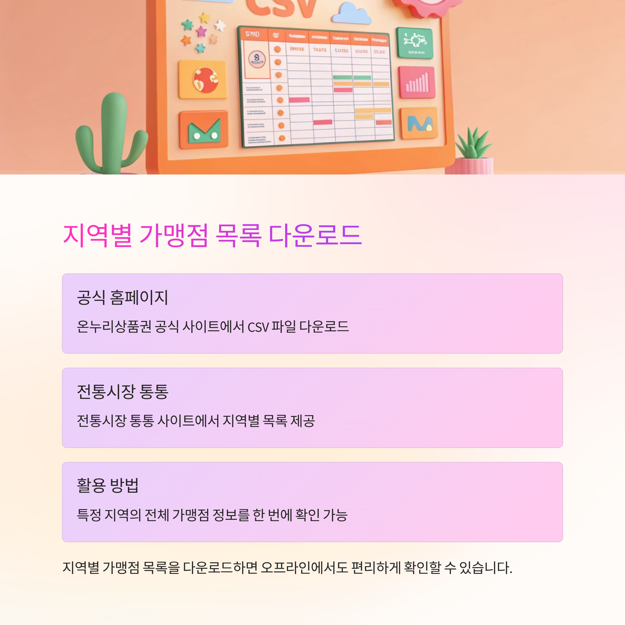 온누리상품권 공식 홈페이지와 "전통시장 통통" 사이트에서는 지역별 가맹점 목록을 CSV 파일로 다운로드할 수 있습니다. 특정 지역의 전체 가맹점 정보를 한 번에 확인하고 싶을 때 이 기능을 활용하면 매우 유용합니다.