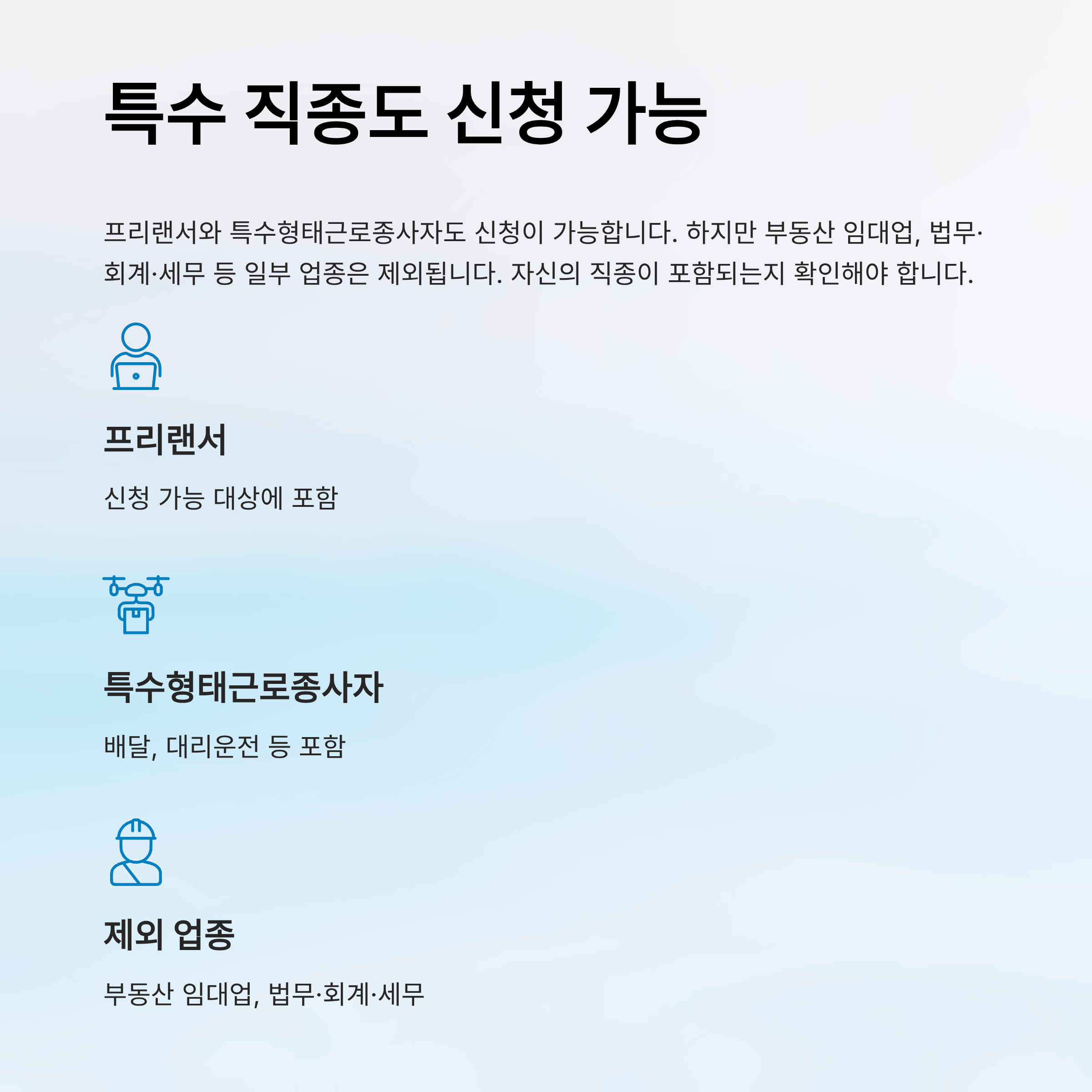 프리랜서와 특수형태근로종사자도 신청이 가능하다. 하지만 부동산 임대업, 법무·회계·세무 등 일부 업종은 제외된다. 자신의 직종이 포함되는지 확인해야 한다.