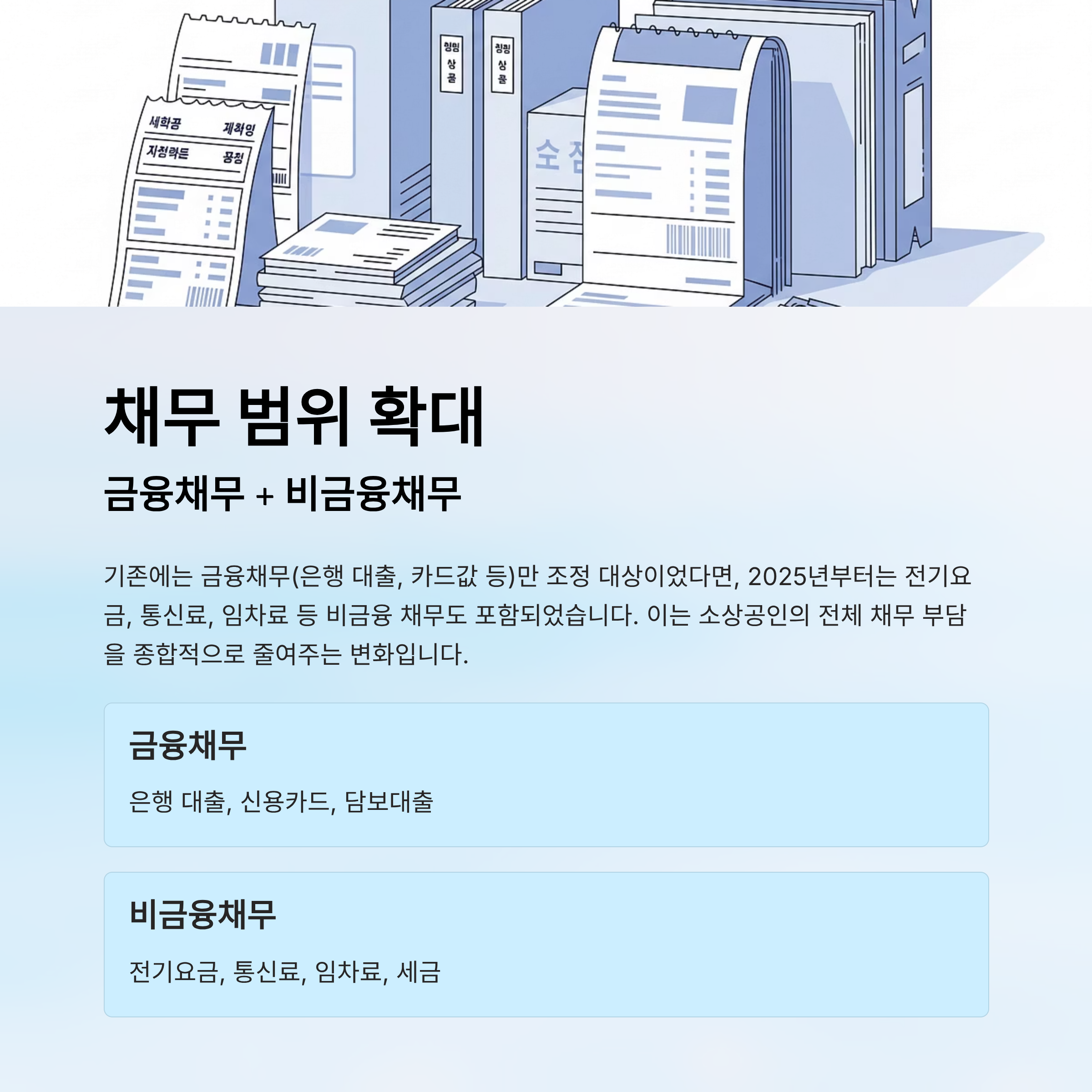 기존에는 금융채무(은행 대출, 카드값 등)만 조정 대상이었다면, 2025년부터는 전기요금, 통신료, 임차료 등 비금융 채무도 포함되었다. 이는 소상공인의 전체 채무 부담을 종합적으로 줄여주는 변화다.