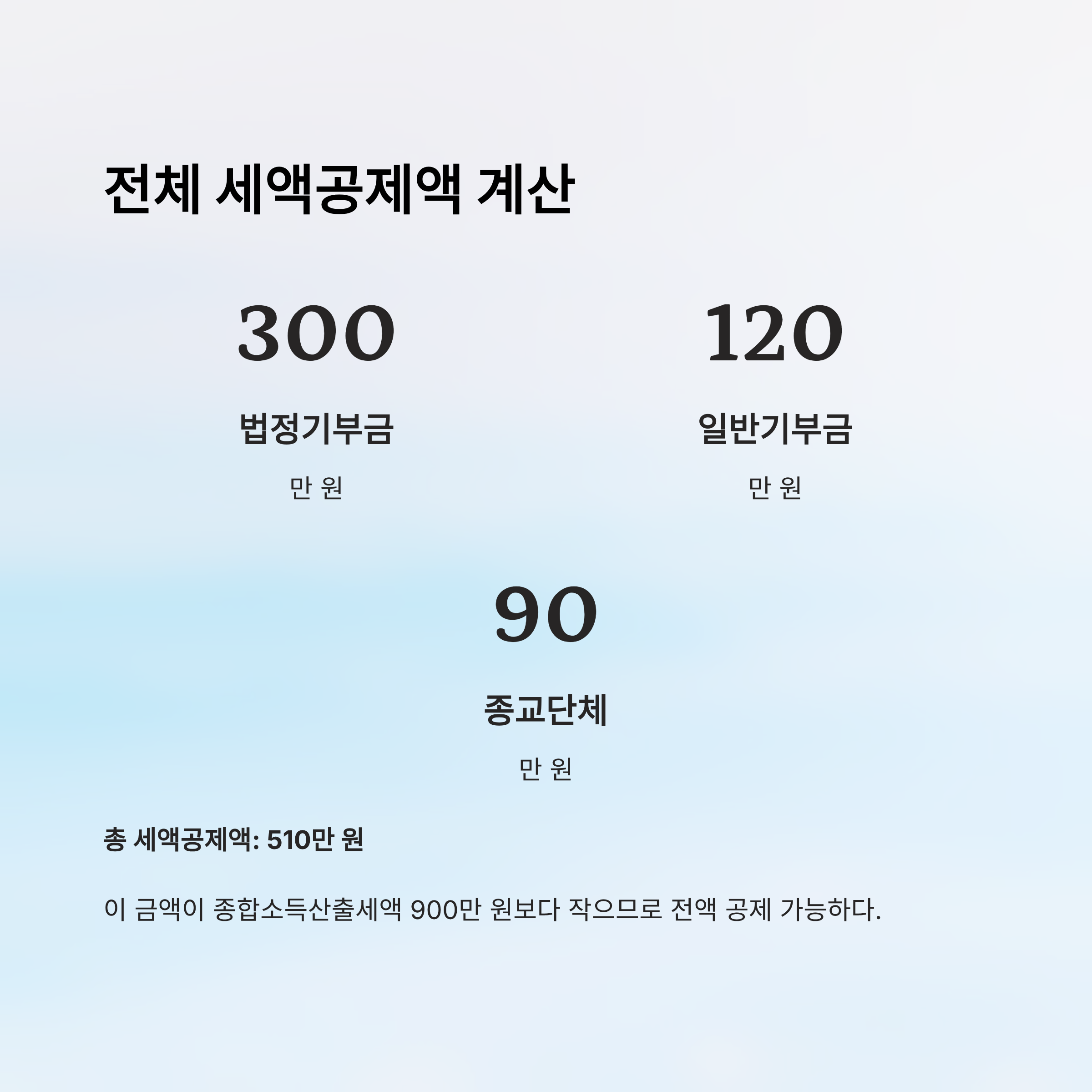 총 세액공제액 = 300만 원 + 120만 원 + 90만 원 = 510만 원
