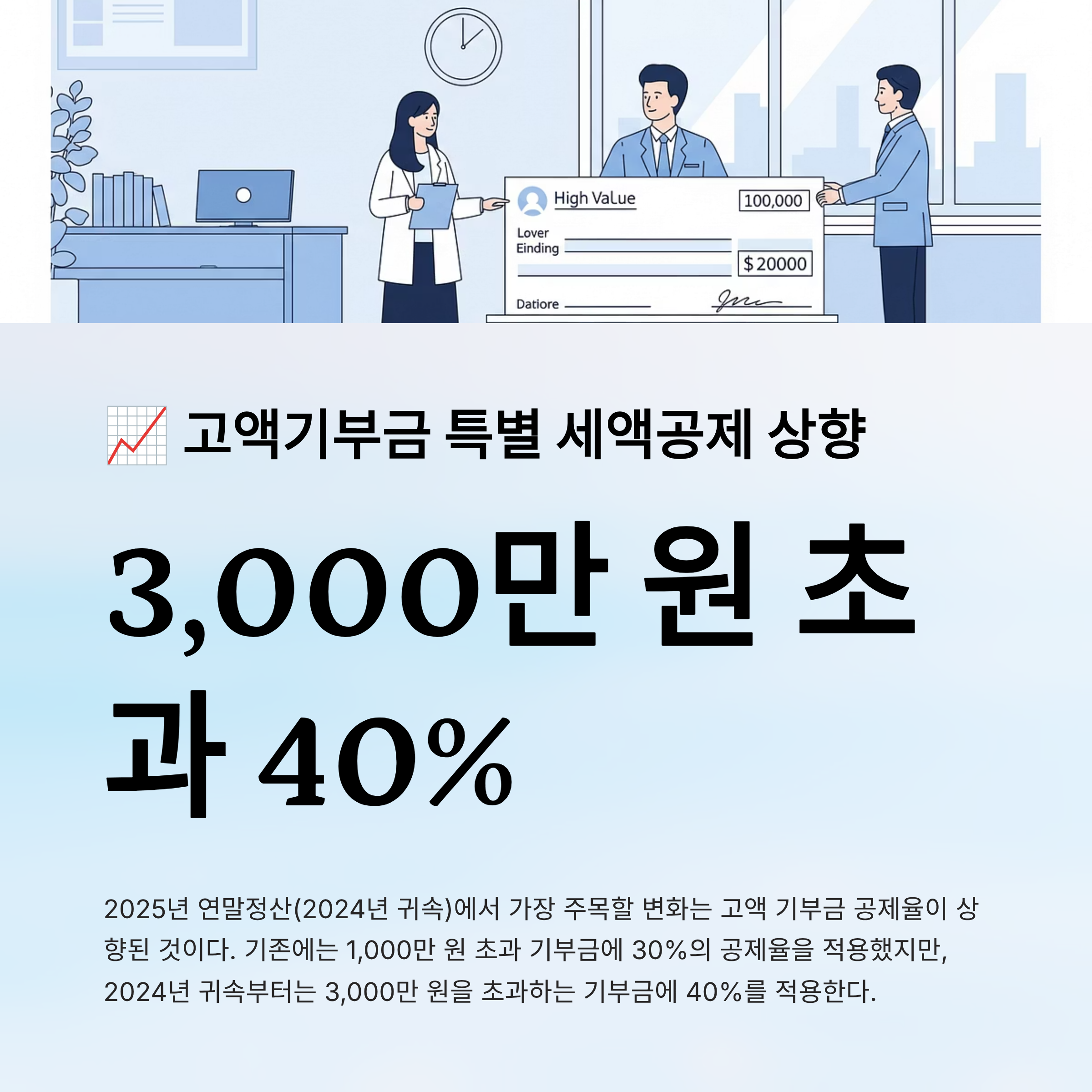 📈 6. 고액기부금 특별 세액공제 상향: 3,000만 원 초과 40%