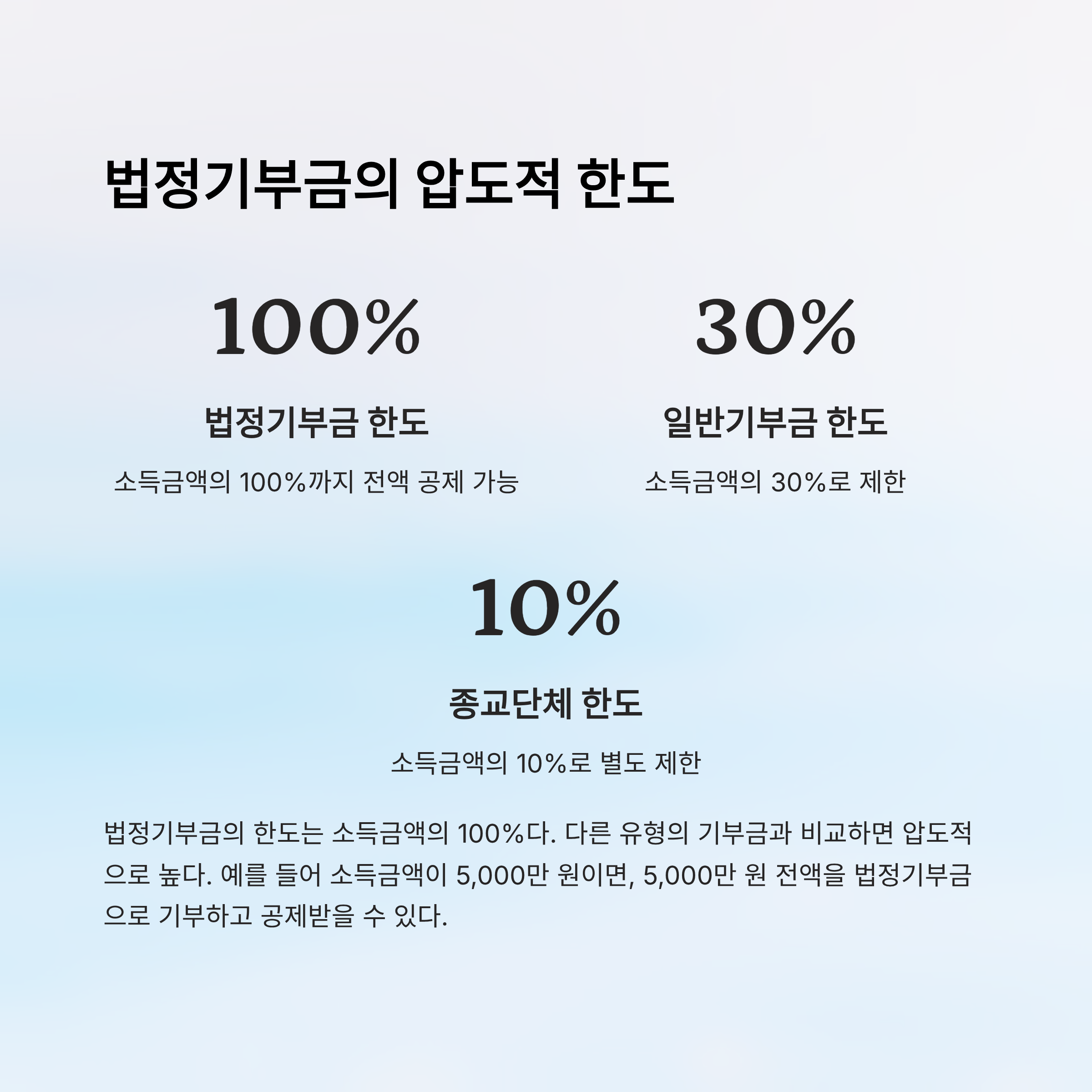 🤝 4. 일반기부금 공제한도: 소득금액 30%, 종교단체 10% 별도