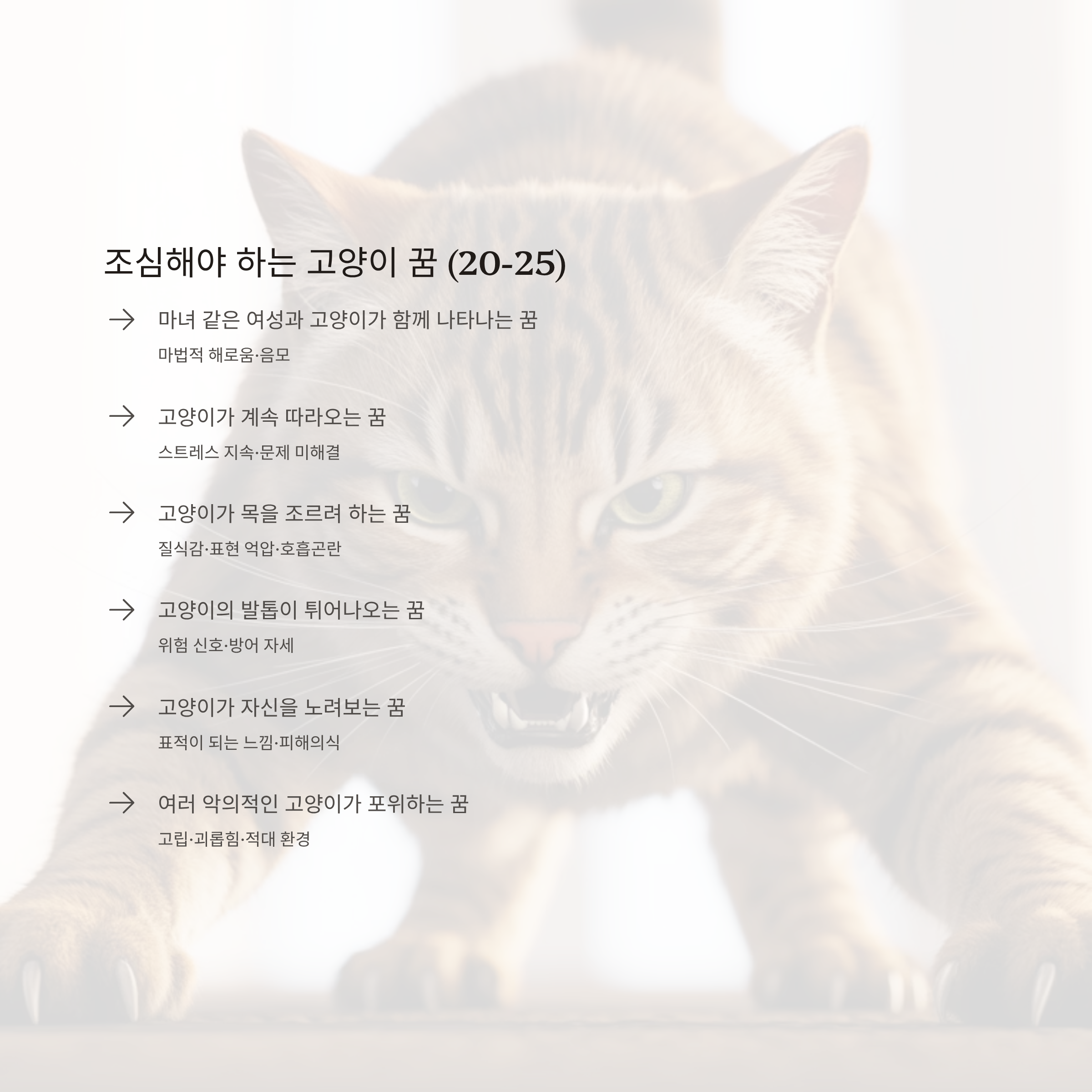 25. 여러 악의적인 고양이가 포위하는 꿈 → 고립·괴롭힘·적대 환경