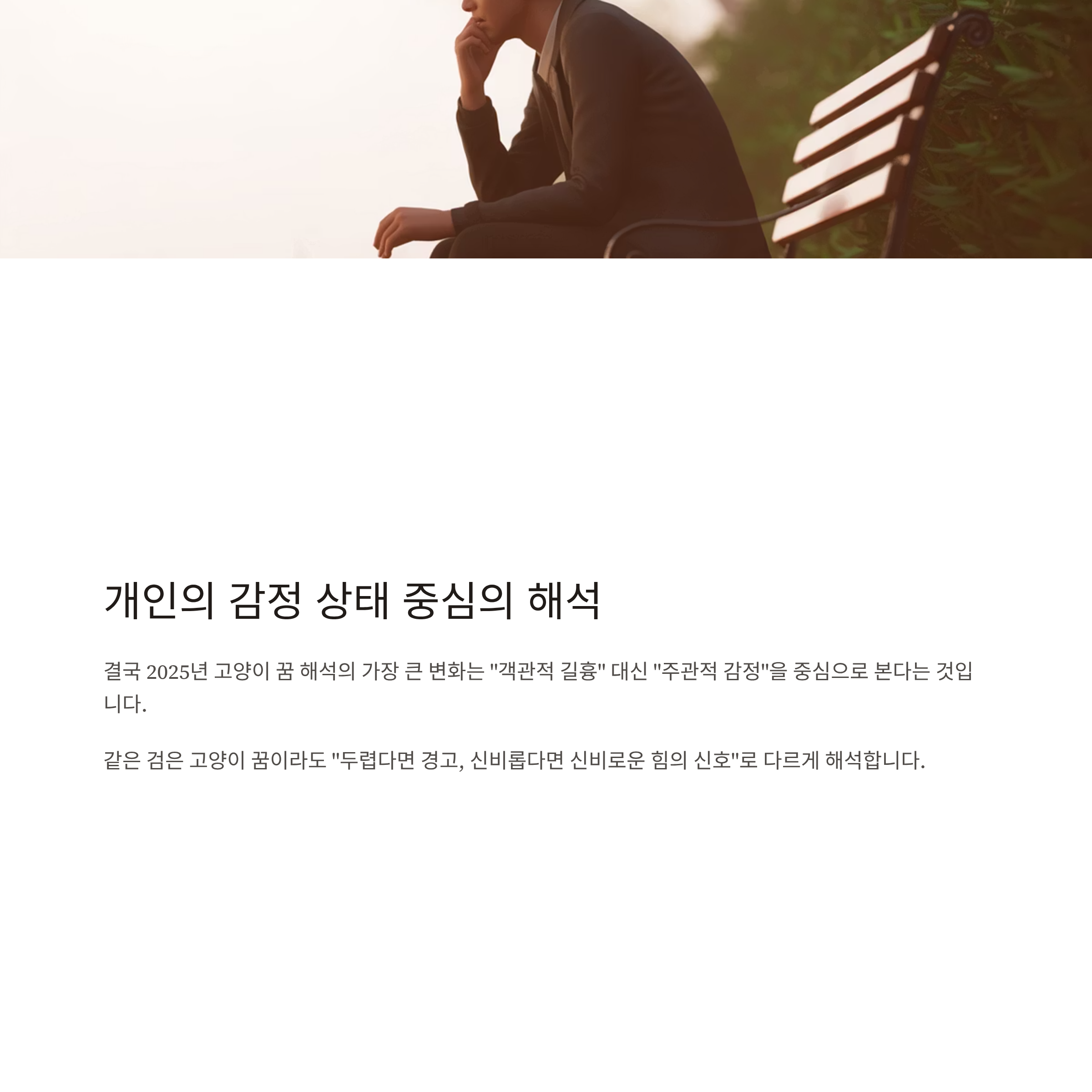 결국 2025년 고양이 꿈 해석의 가장 큰 변화는 "객관적 길흉" 대신 "주관적 감정"을 중심으로 본다는 것입니다.