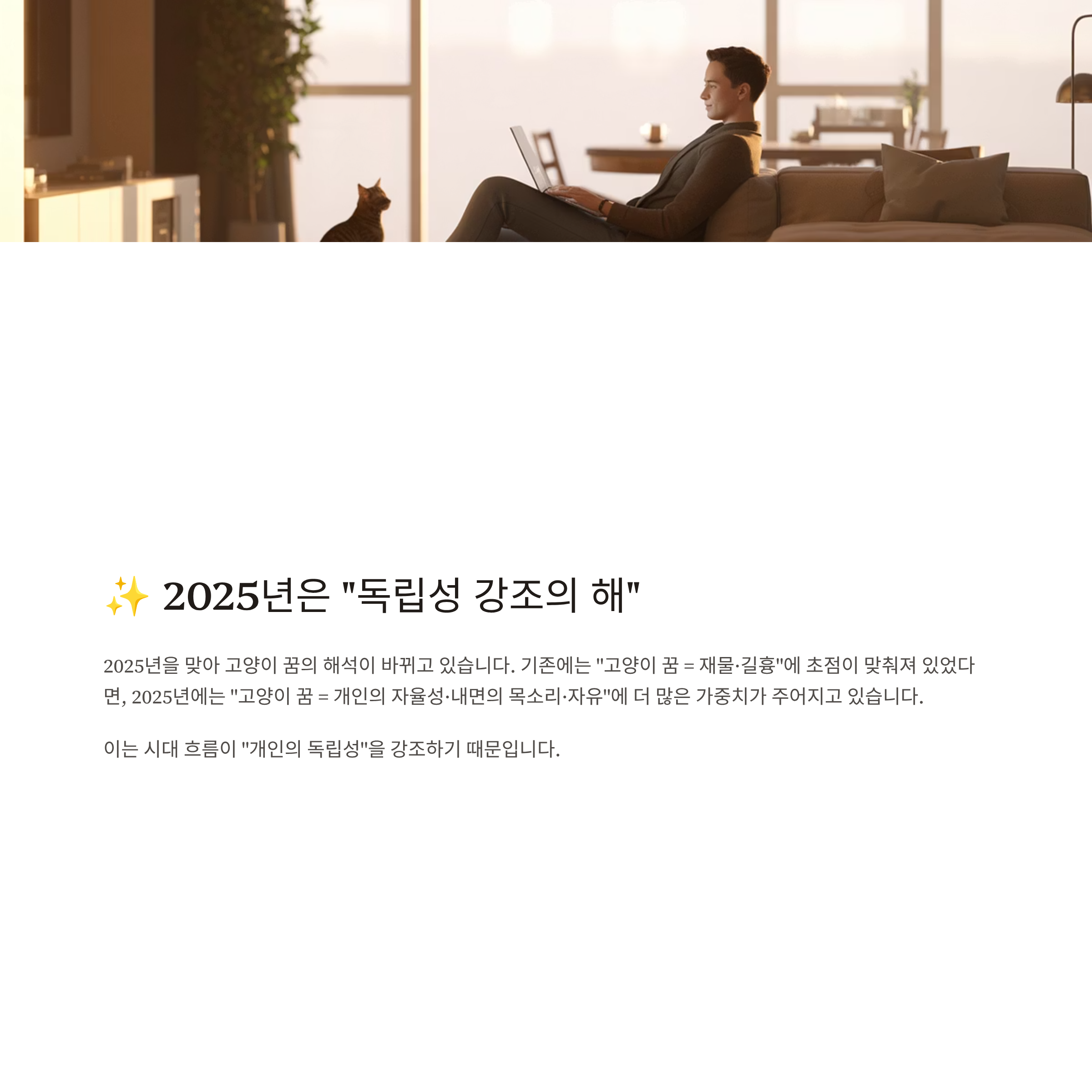 기존에는 "고양이 꿈 = 재물·길흉"에 초점이 맞춰져 있었다면, 2025년에는 "고양이 꿈 = 개인의 자율성·내면의 목소리·자유"에 더 많은 가중치가 주어지고 있습니다.
