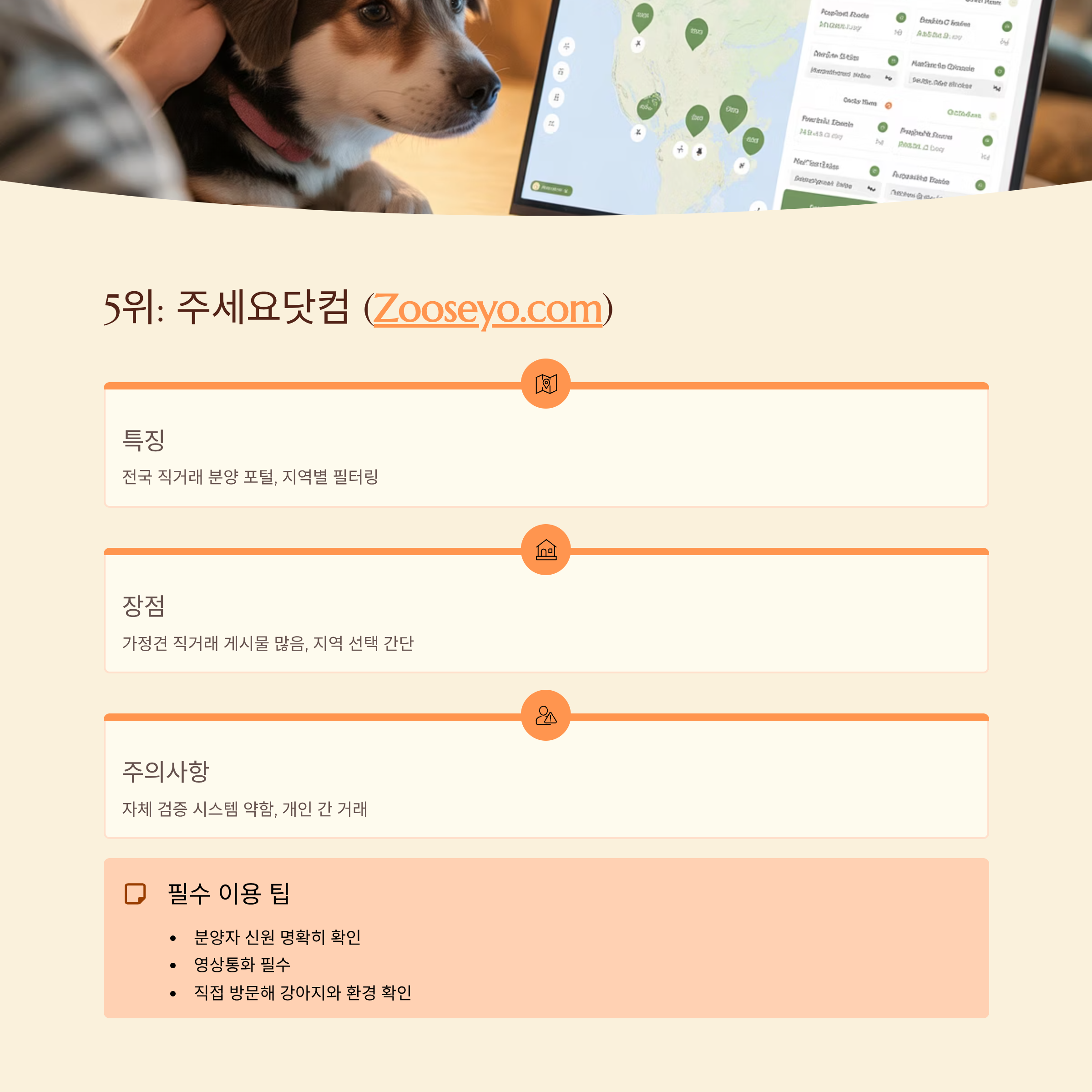 | 5위 | 주세요닷컴 (Zooseyo) | 전국 직거래 분양 포털 | ⭐⭐⭐ | 지역별 검색 용이, 가정견 多