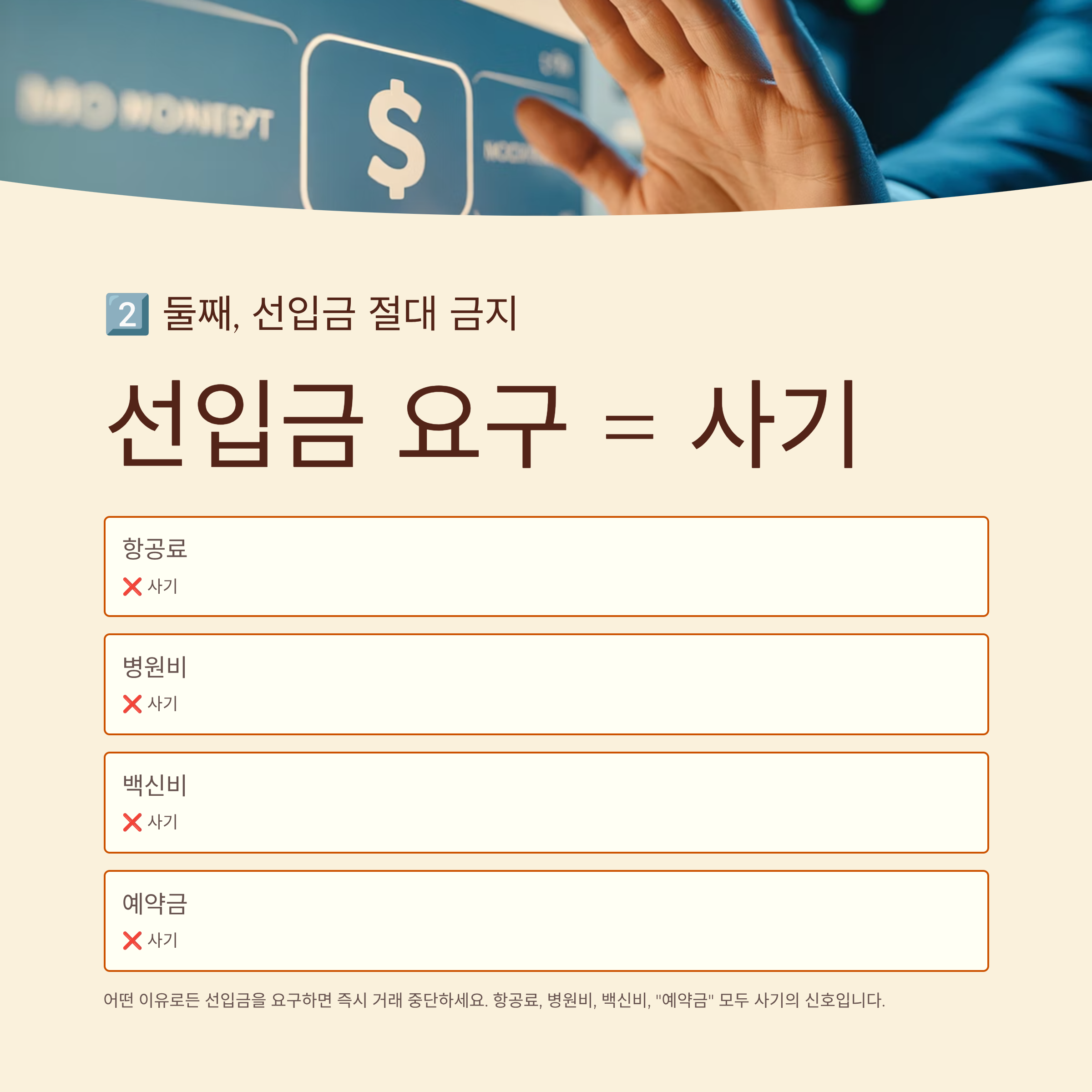 어떤 이유로든 선입금을 요구하면 즉시 거래 중단하세요. 항공료, 병원비, 백신비, "예약금" 모두 사기의 신호입니다.