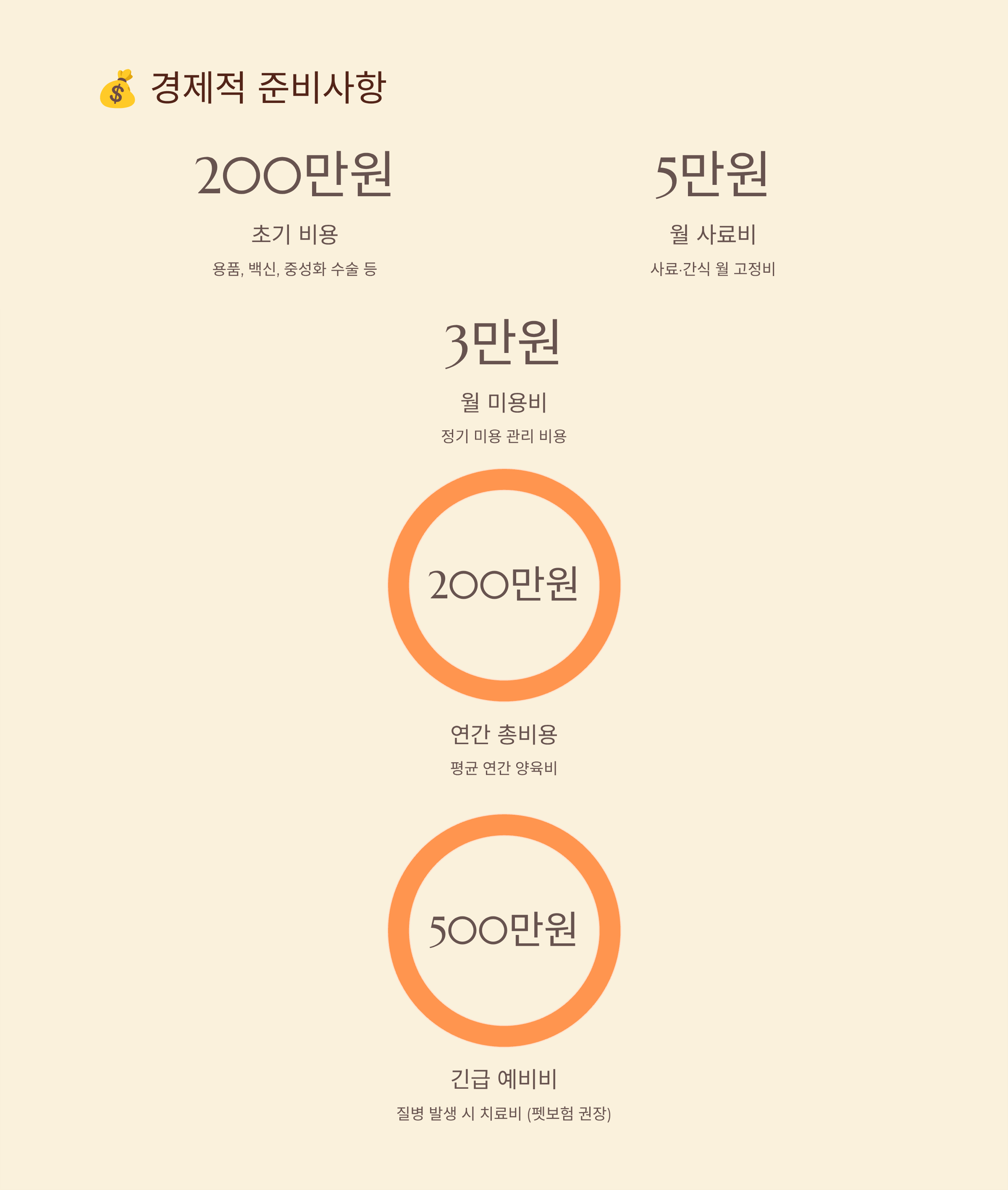 - 월 고정비: 사료·간식 5만 원, 미용 3~5만 원
