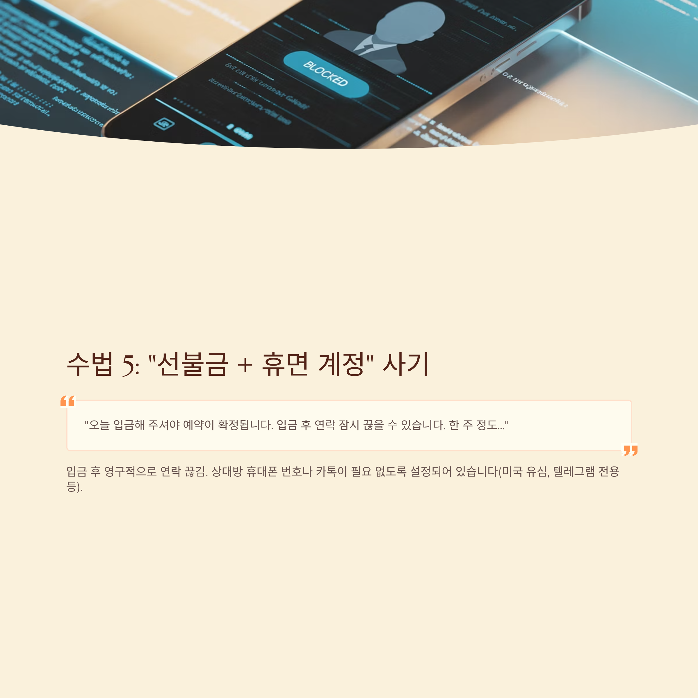 → 입금 후 영구적으로 연락 끊김. 상대방 휴대폰 번호나 카톡이 필요 없도록 설정되어 있습니다(미국 유심, 텔레그램 전용 등).