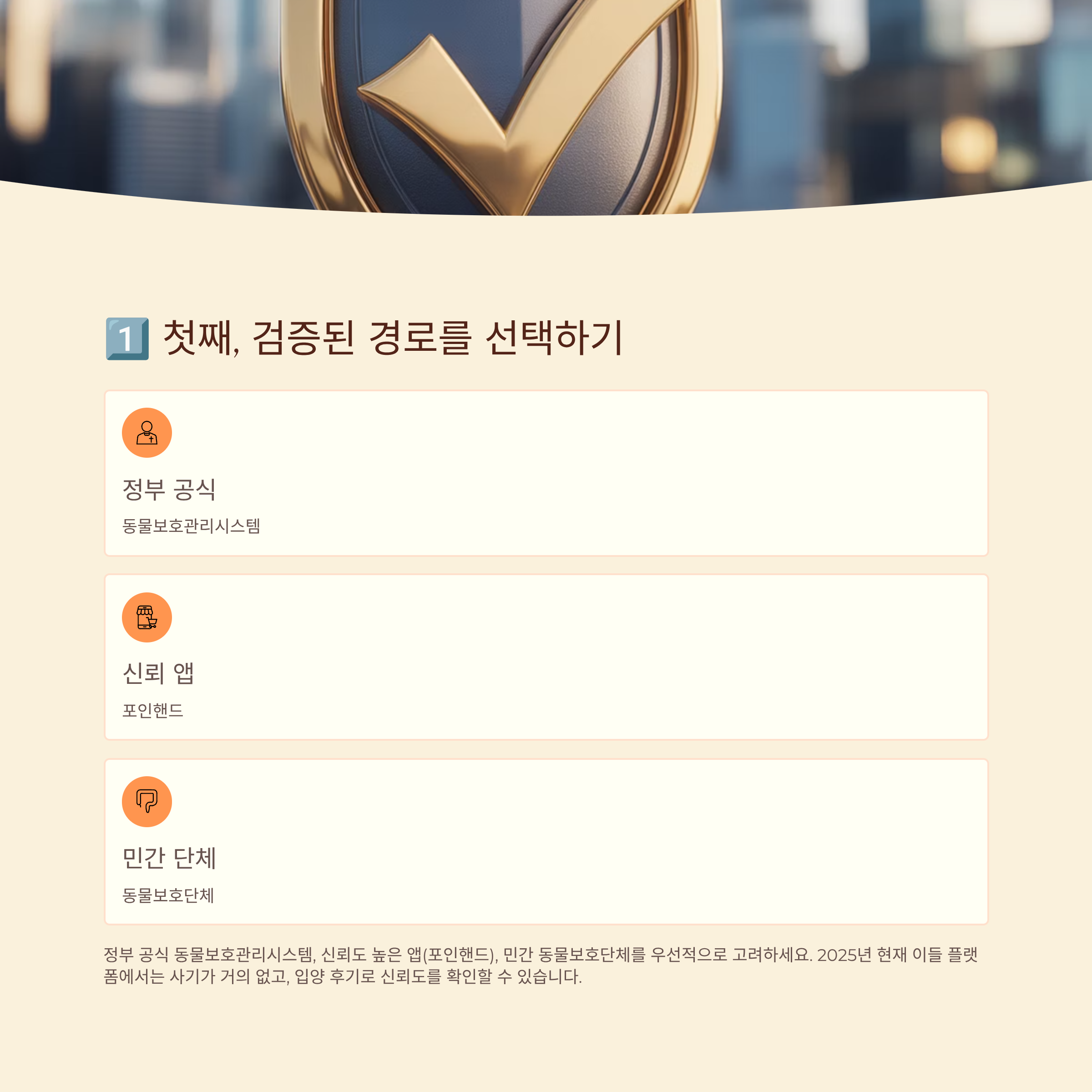 정부 공식 동물보호관리시스템, 신뢰도 높은 앱(포인핸드), 민간 동물보호단체를 우선적으로 고려하세요. 2025년 현재 이들 플랫폼에서는 사기가 거의 없고, 입양 후기로 신뢰도를 확인할 수 있습니다.