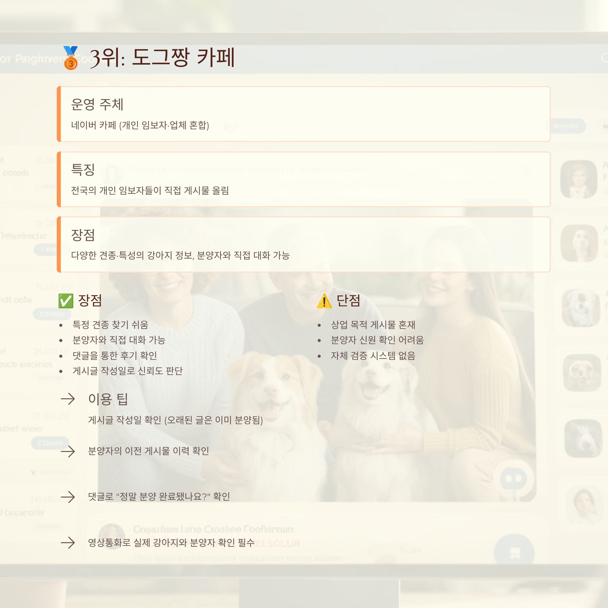 | 3위 | 도그짱 카페 | 네이버 카페 커뮤니티 | ⭐⭐⭐⭐ | 개인 임보자 많음, 후기 확인 용이