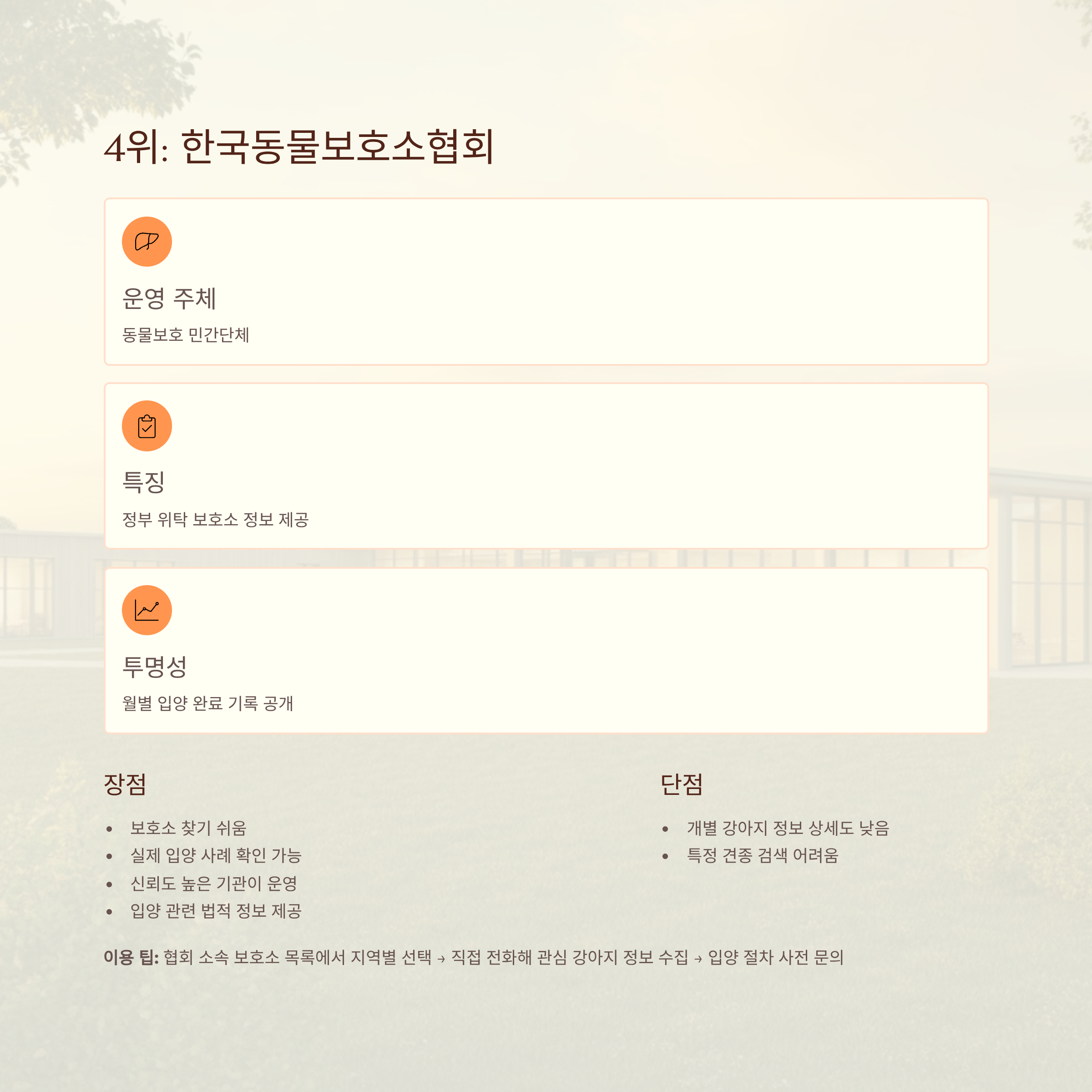 | 4위 | 한국동물보호소협회 | 동물보호 민간단체 | ⭐⭐⭐⭐ | 정부 위탁 보호소 정보, 입양 후기 多