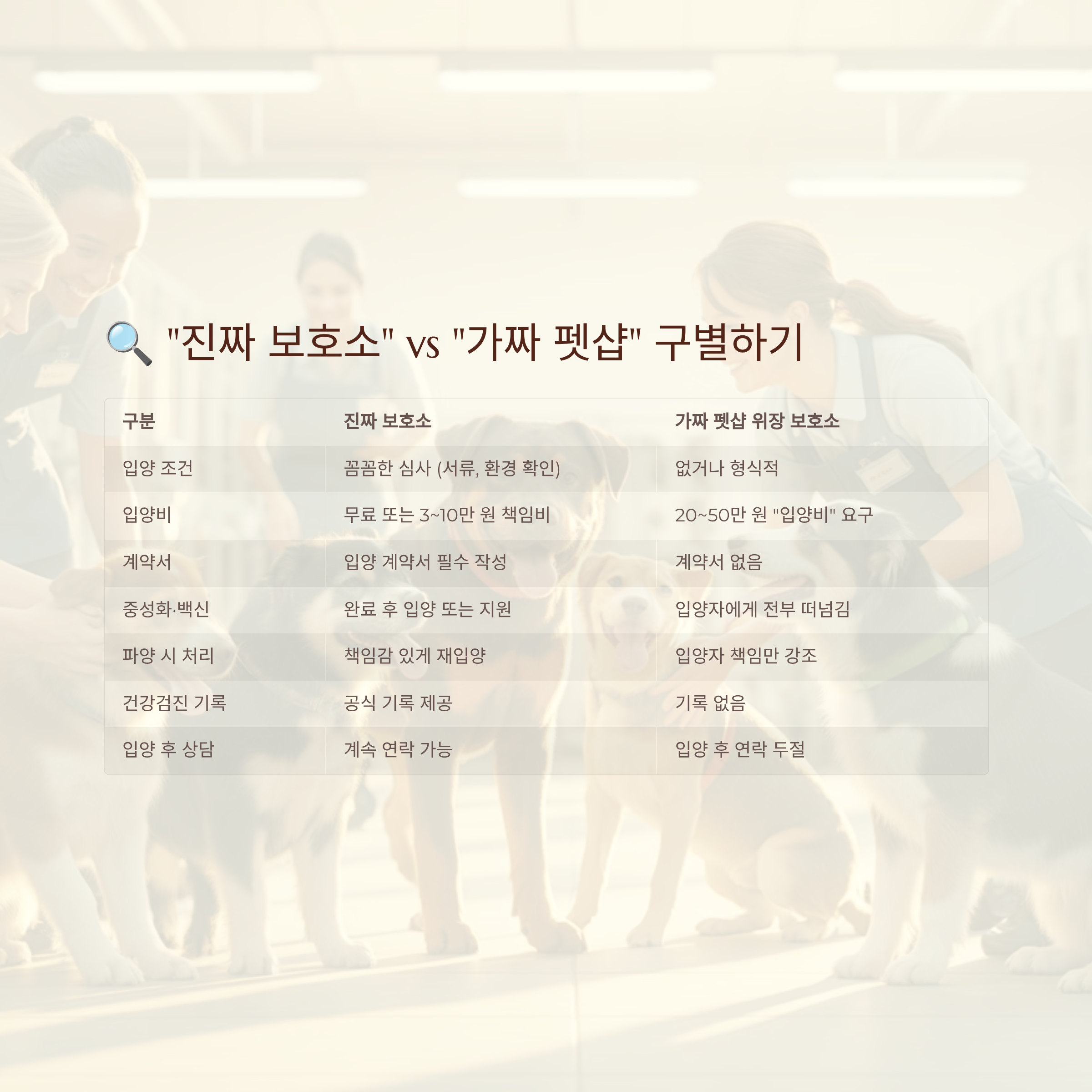 | 입양비 | 무료 또는 3~10만 원 책임비 | 20~50만 원 "입양비" 요구