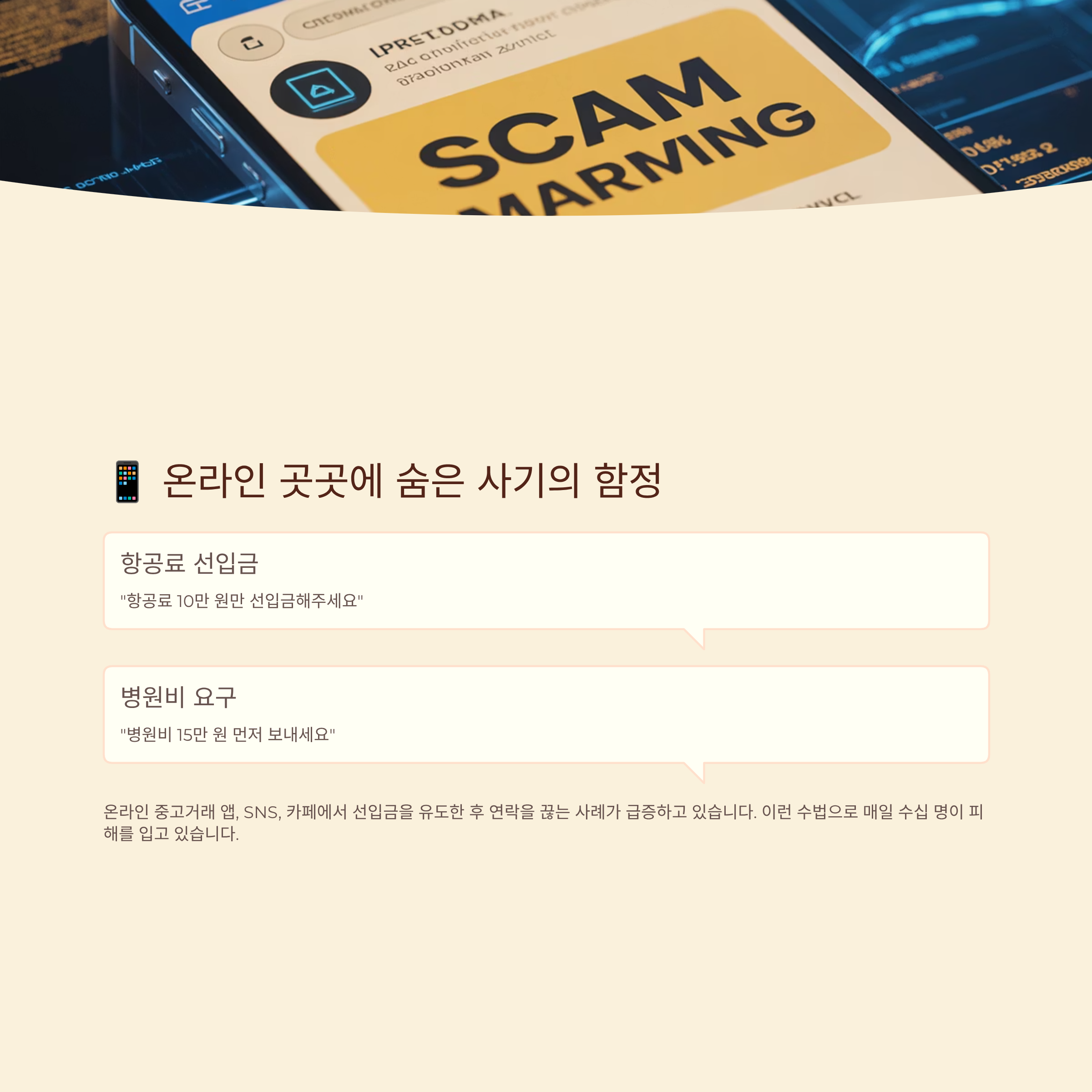 온라인 중고거래 앱, SNS, 카페에서는 "항공료 10만 원만 선입금해주세요", "병원비 15만 원 먼저 보내세요"라는 식으로 선입금을 유도한 후 연락을 끊는 사례가 증가하고 있습니다.