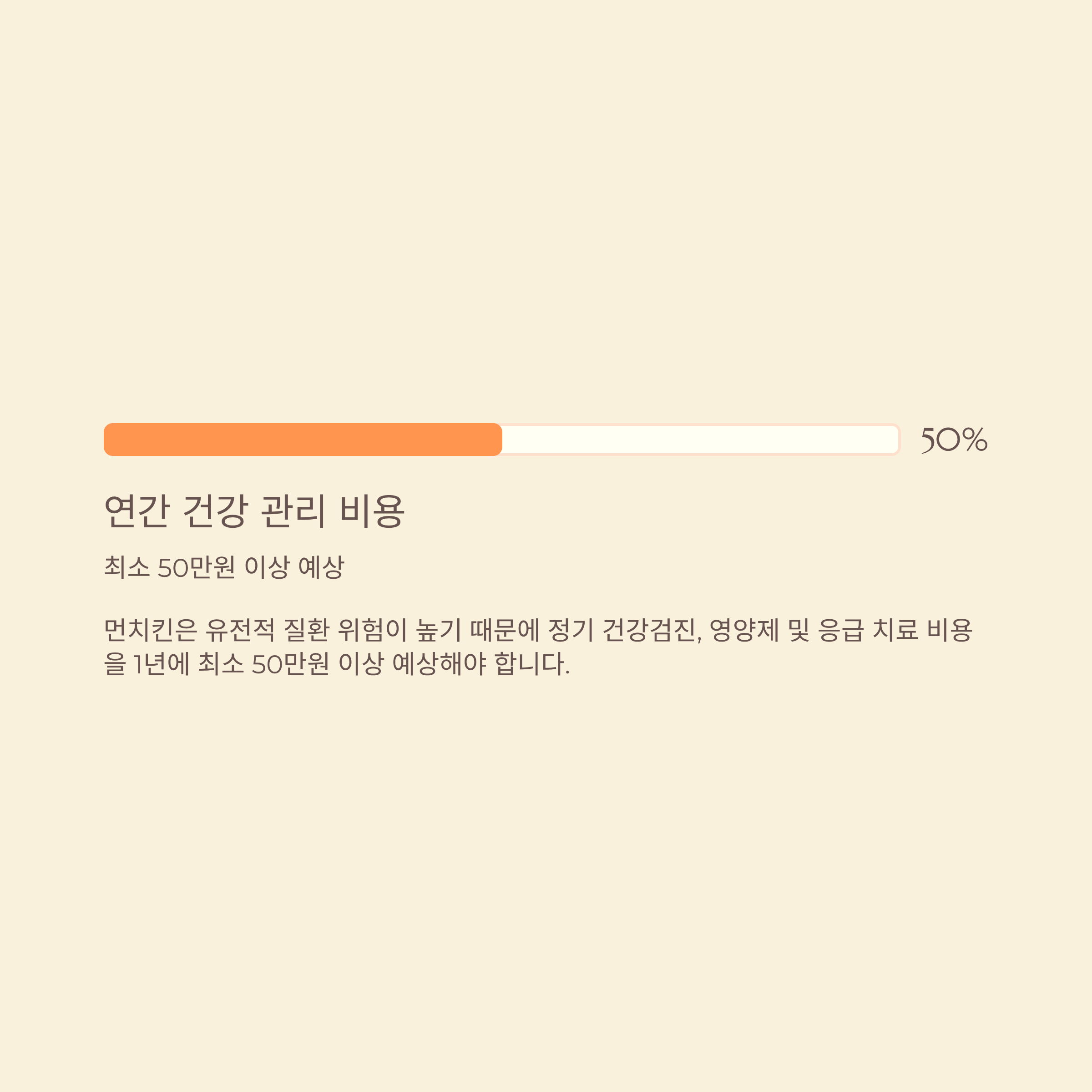 먼치킨은 유전적 질환 위험이 높기 때문에 정기 건강검진, 영양제 및 응급 치료 비용을 1년에 최소 50만원 이상 예상해야 합니다.