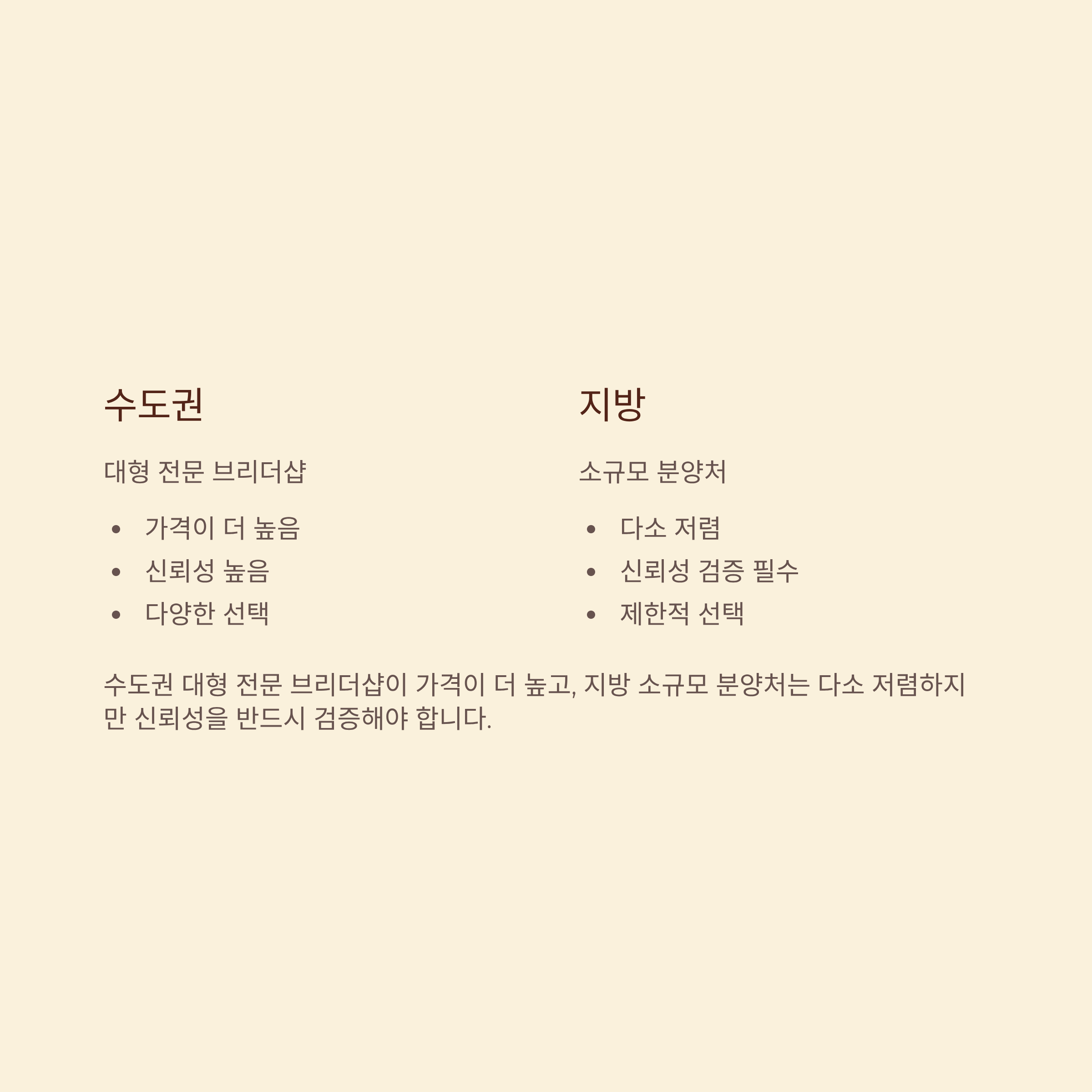 수도권 대형 전문 브리더샵이 가격이 더 높고, 지방 소규모 분양처는 다소 저렴하지만 신뢰성을 반드시 검증해야 합니다.
