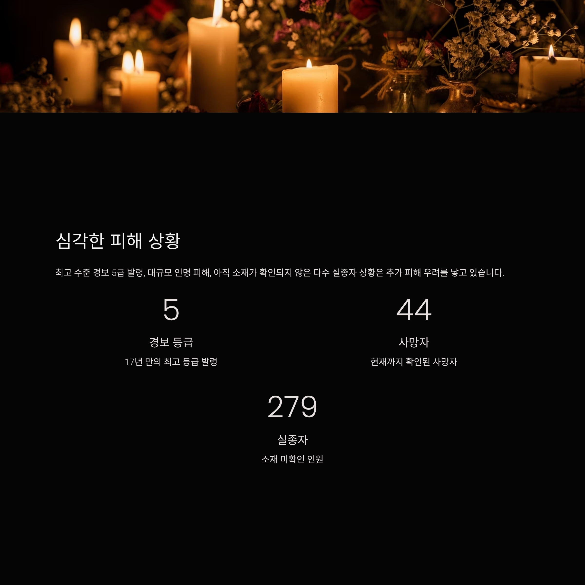 최고 수준 경보 5급 발령, 대규모 인명 피해, 아직 소재가 확인되지 않은 다수 실종자 상황은 추가 피해 우려를 낳고 있습니다.