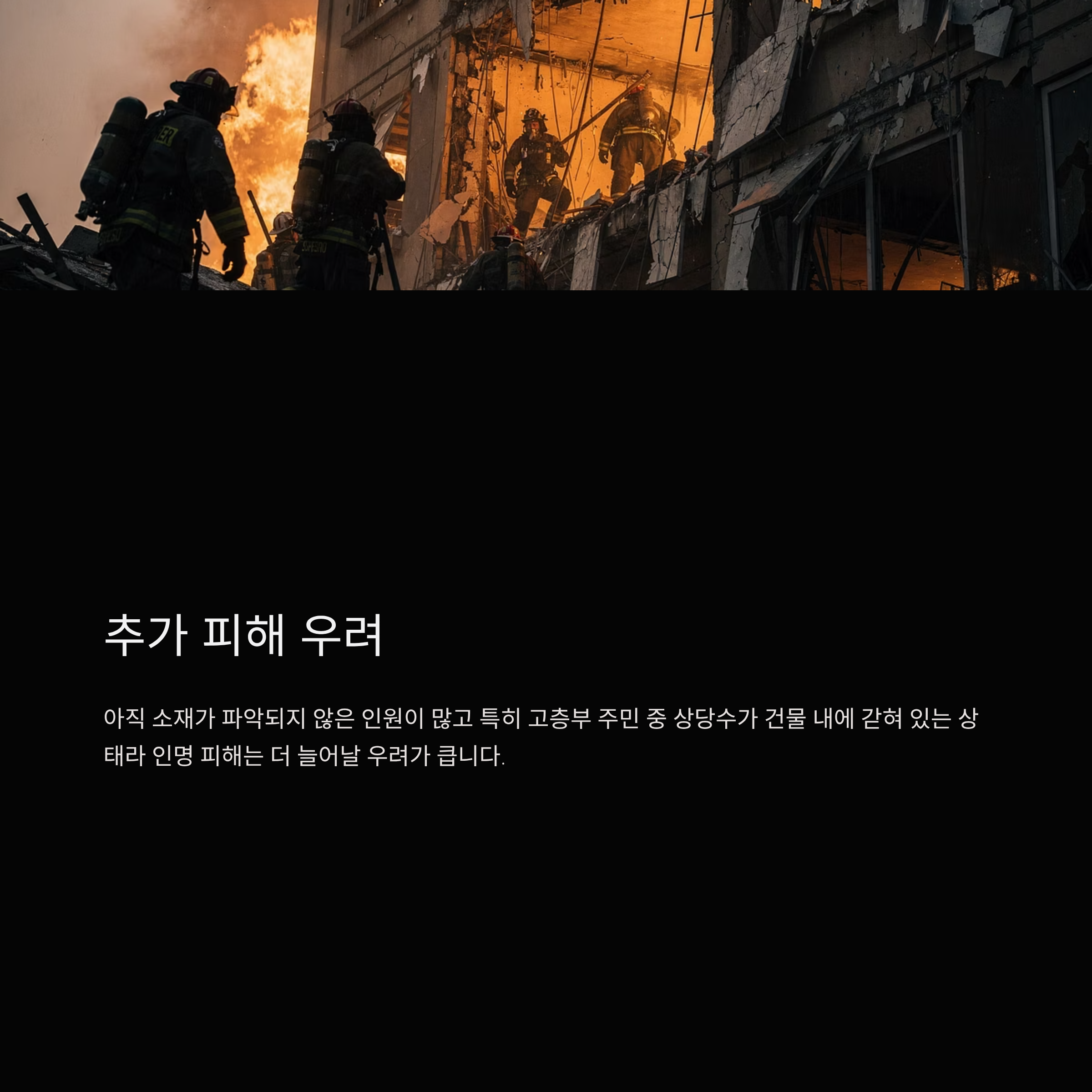 아직 소재가 파악되지 않은 인원이 많고 특히 고층부 주민 중 상당수가 건물 내에 갇혀 있는 상태라 인명 피해는 더 늘어날 우려가 큽니다.
