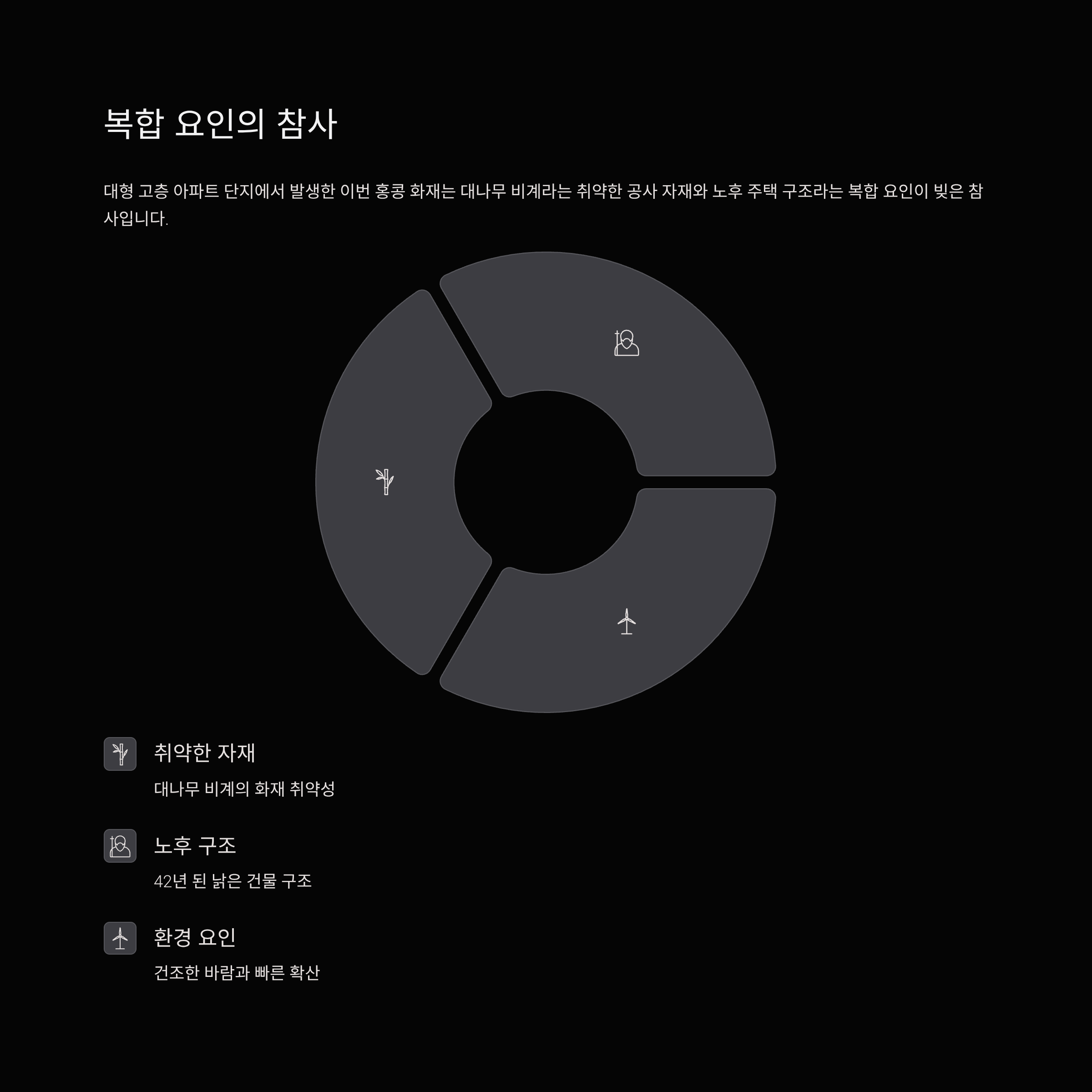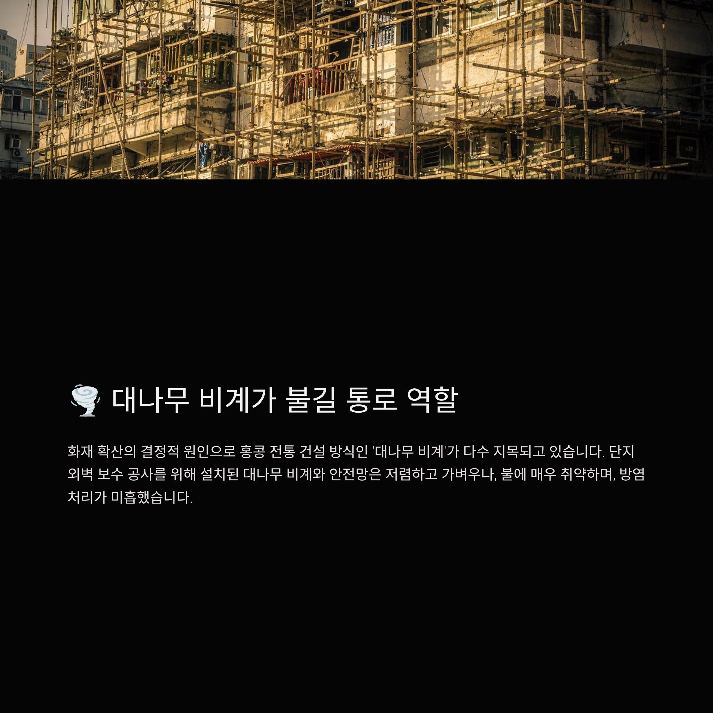 대형 고층 아파트 단지에서 발생한 이번 홍콩 화재는 대나무 비계라는 취약한 공사 자재와 노후 주택 구조라는 복합 요인이 빚은 참사입니다.
