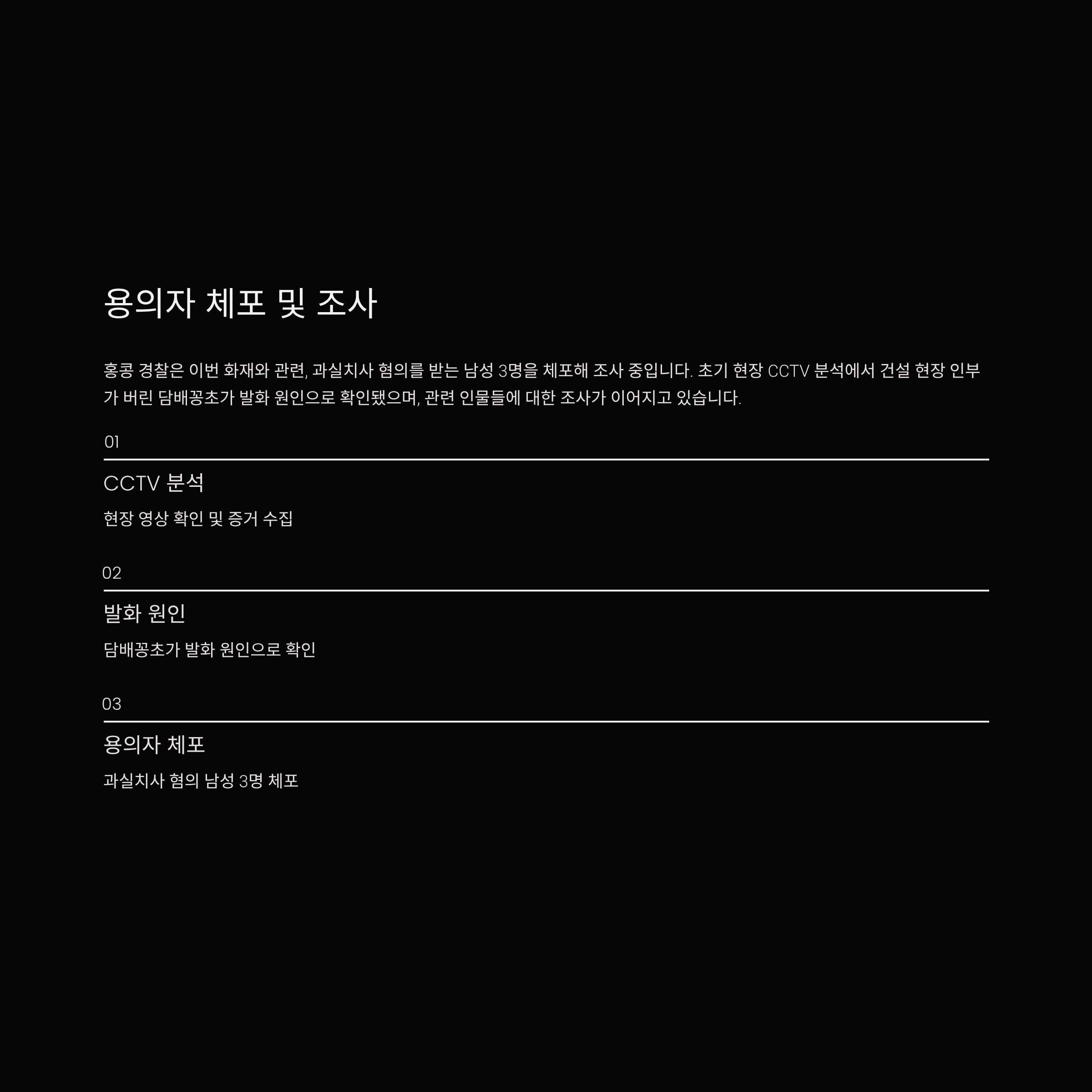 홍콩 경찰은 이번 화재와 관련, 과실치사 혐의를 받는 남성 3명을 체포해 조사 중입니다. 초기 현장 CCTV 분석에서 건설 현장 인부가 버린 담배꽁초가 발화 원인으로 확인됐으며, 관련 인물들에 대한 조사가 이어지고 있습니다.