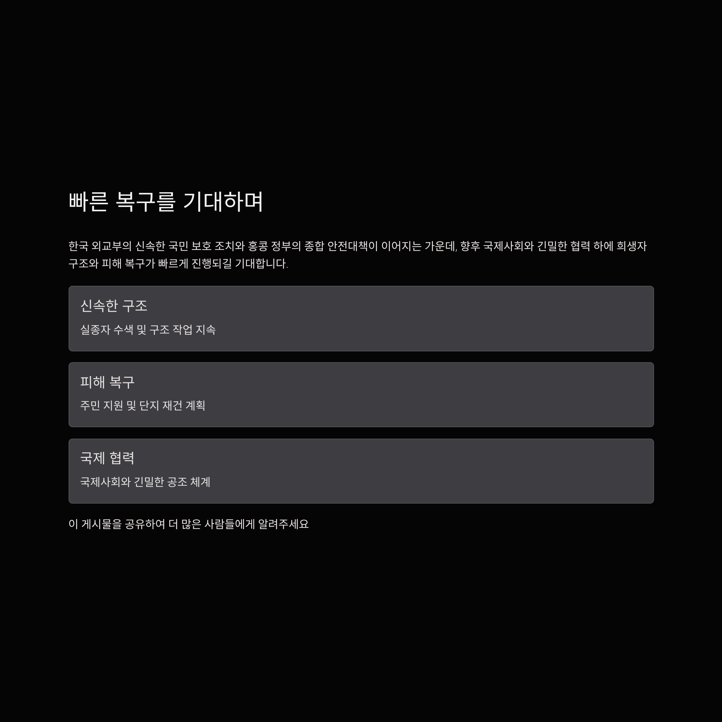 한국 외교부의 신속한 국민 보호 조치와 홍콩 정부의 종합 안전대책이 이어지는 가운데, 향후 국제사회와 긴밀한 협력 하에 희생자 구조와 피해 복구가 빠르게 진행되길 기대합니다.