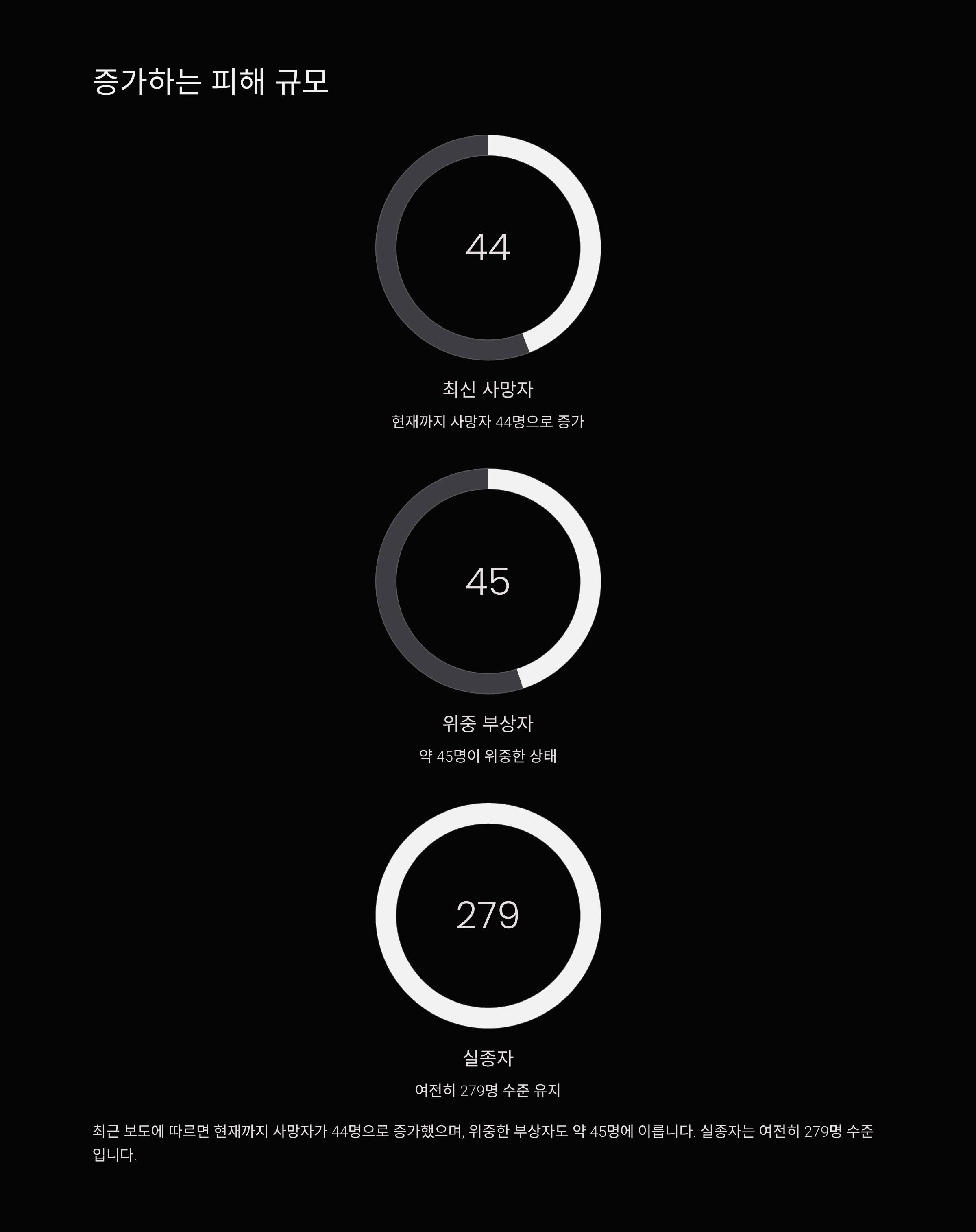 최근 보도에 따르면 현재까지 사망자가 44명으로 증가했으며, 위중한 부상자도 약 45명에 이릅니다. 실종자는 여전히 279명 수준입니다.