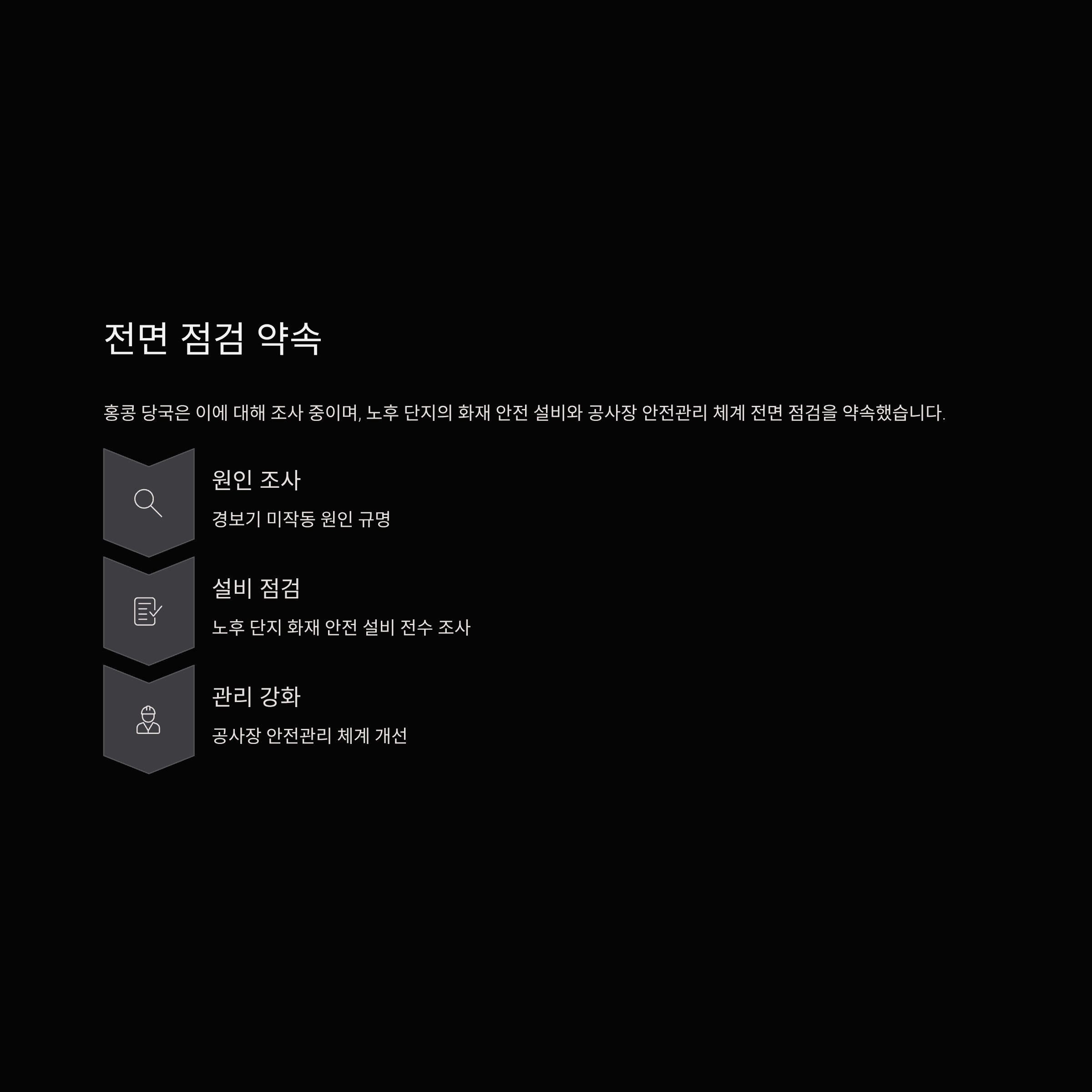 특히 대나무 비계 사용 단계적 금지, 노후 아파트 안전 점검 강화, 화재 경보 설비 고도화 등을 포함한 종합 대책을 추진 중입니다.