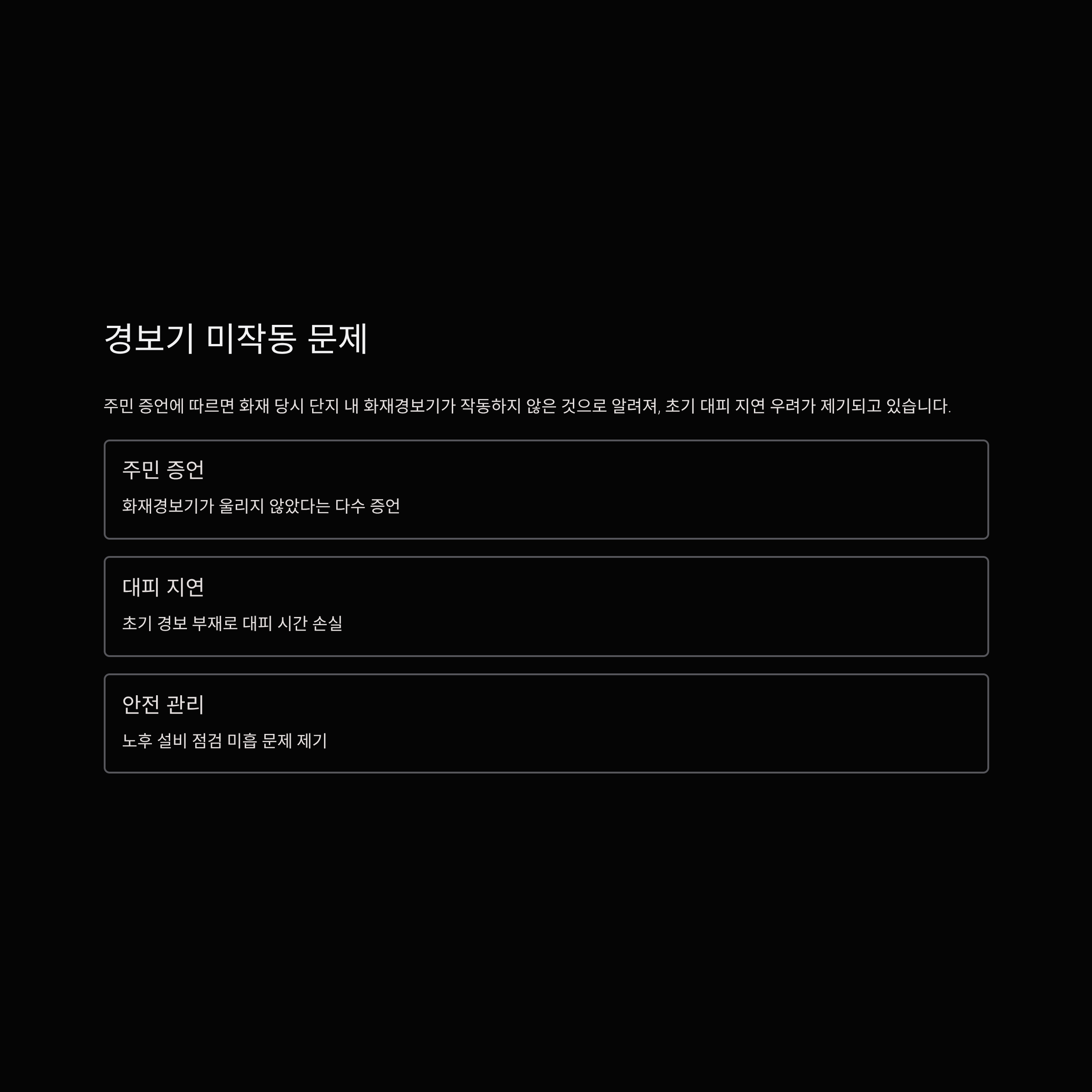 주민 증언에 따르면 화재 당시 단지 내 화재경보기가 작동하지 않은 것으로 알려져, 초기 대피 지연 우려가 제기되고 있습니다.