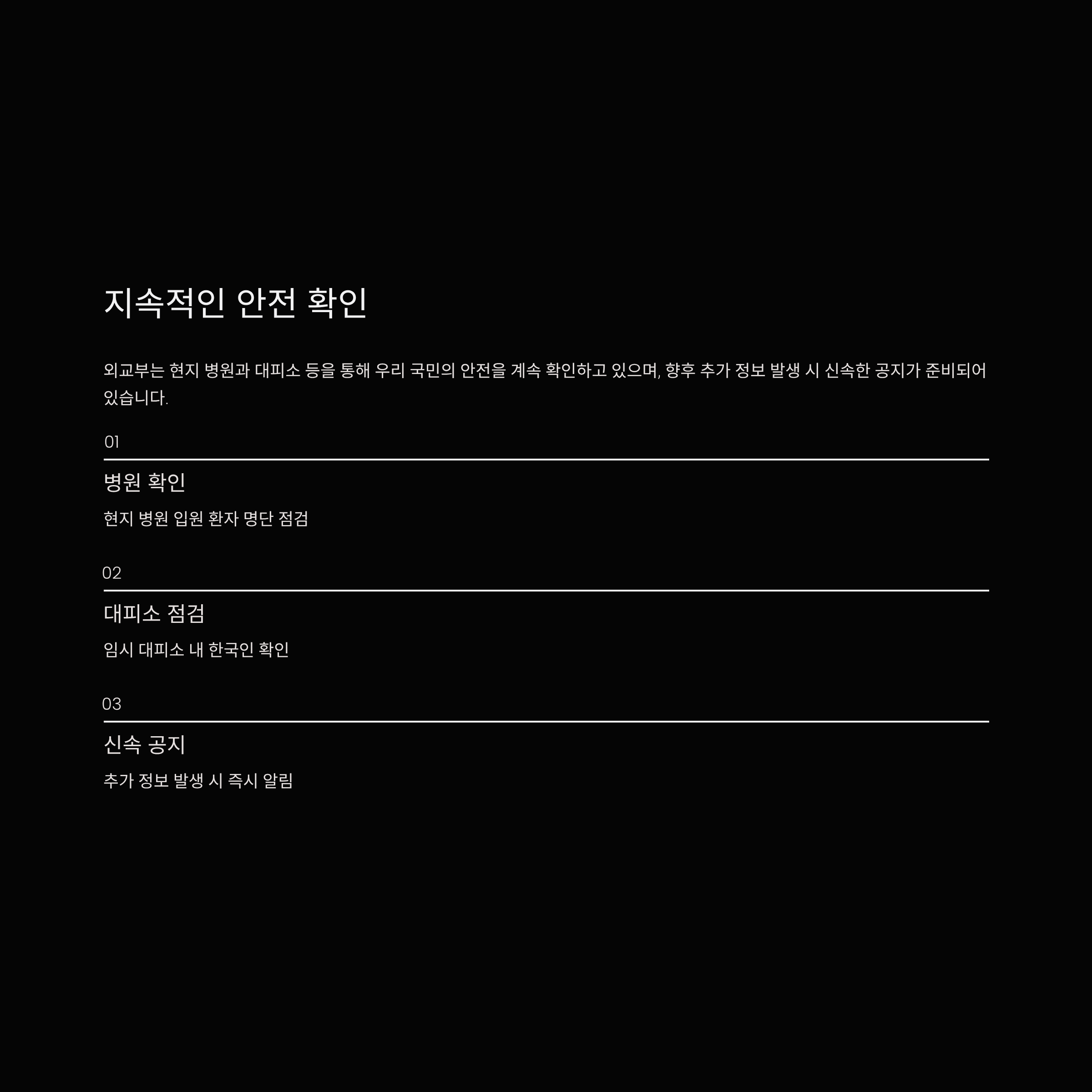 외교부는 현지 병원과 대피소 등을 통해 우리 국민의 안전을 계속 확인하고 있으며, 향후 추가 정보 발생 시 신속한 공지가 준비되어 있습니다.