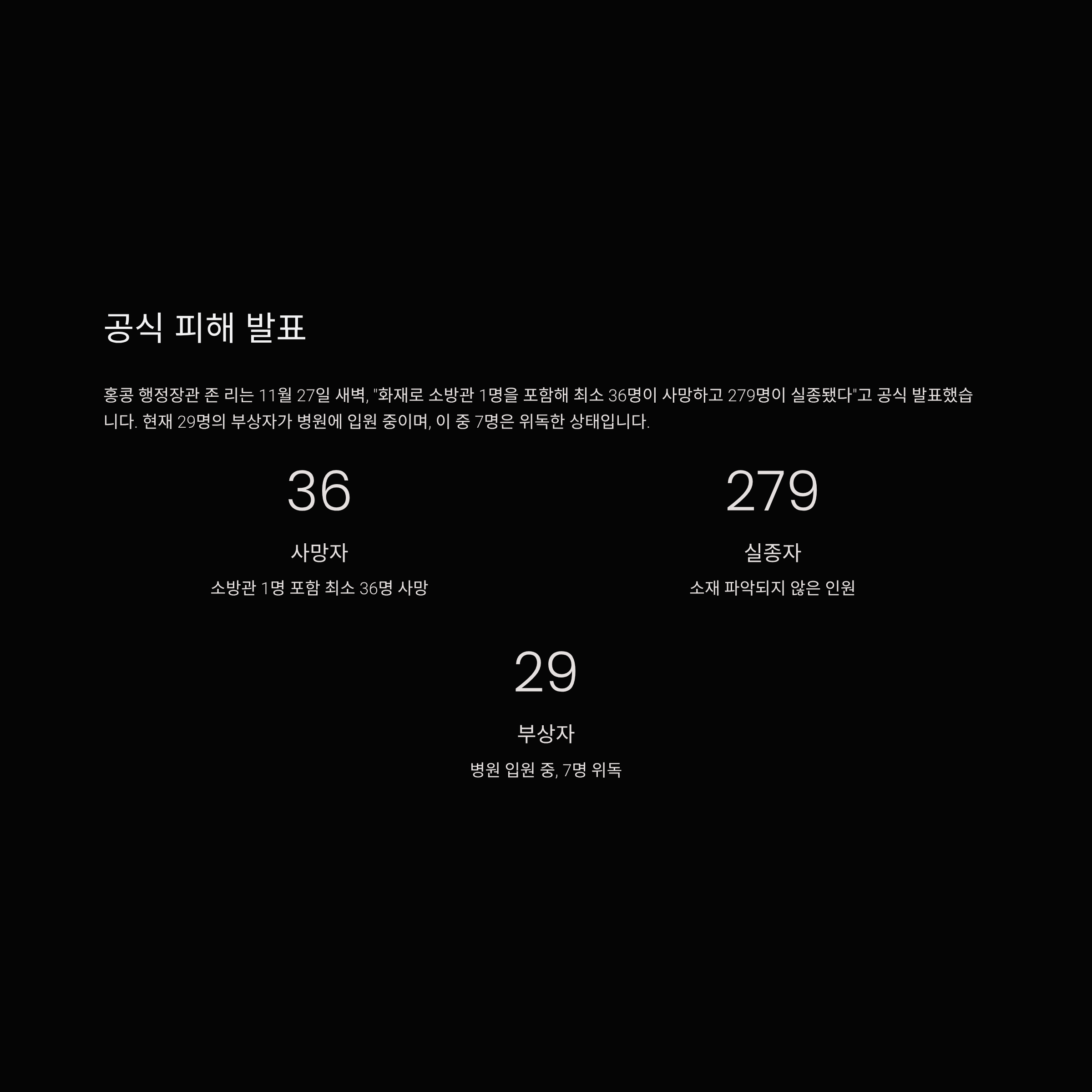 홍콩 행정장관 존 리는 11월 27일 새벽, “화재로 소방관 1명을 포함해 최소 36명이 사망하고 279명이 실종됐다”고 공식 발표했습니다. 현재 29명의 부상자가 병원에 입원 중이며, 이 중 7명은 위독한 상태입니다.