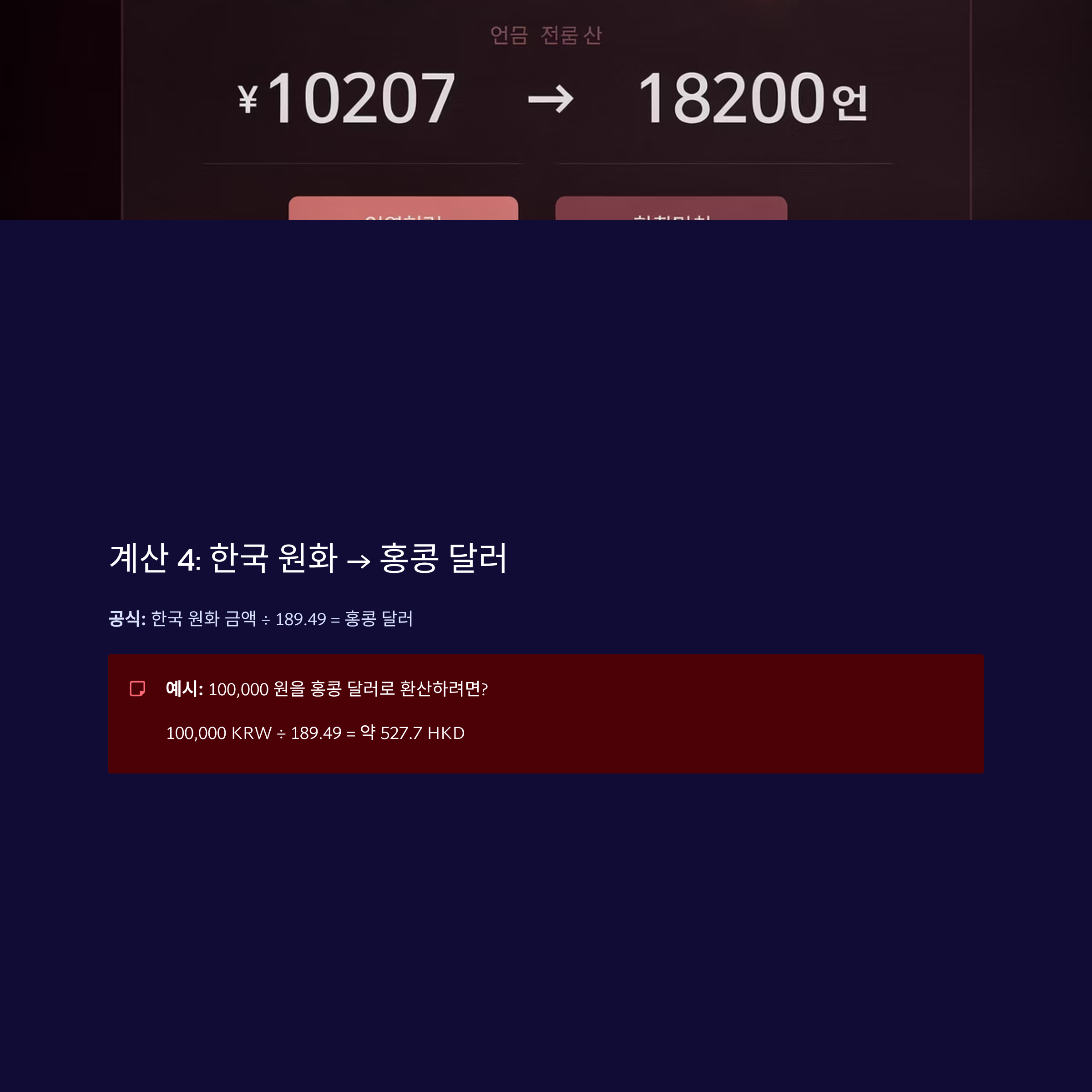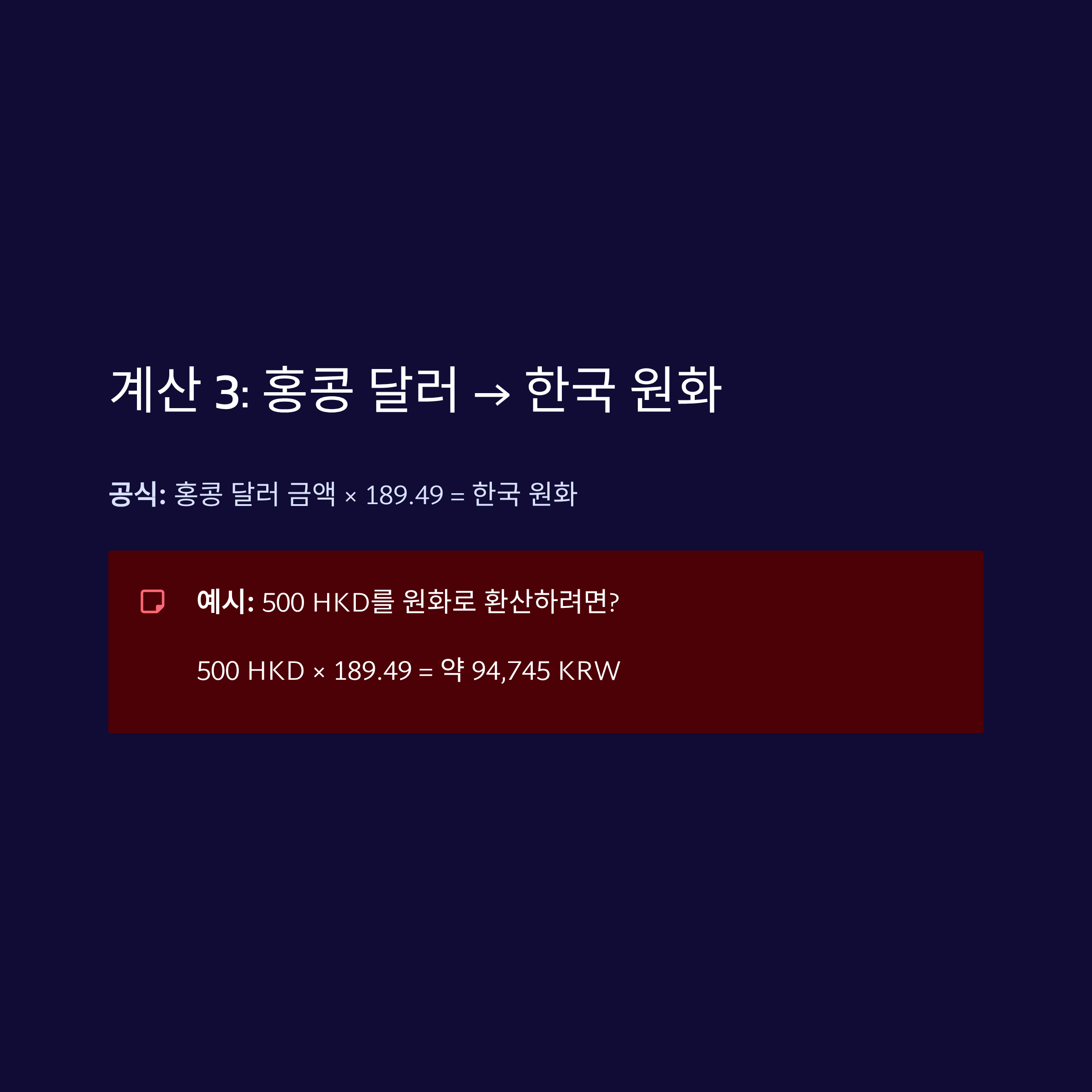 공식: 한국 원화 금액 ÷ 189.49 = 홍콩 달러