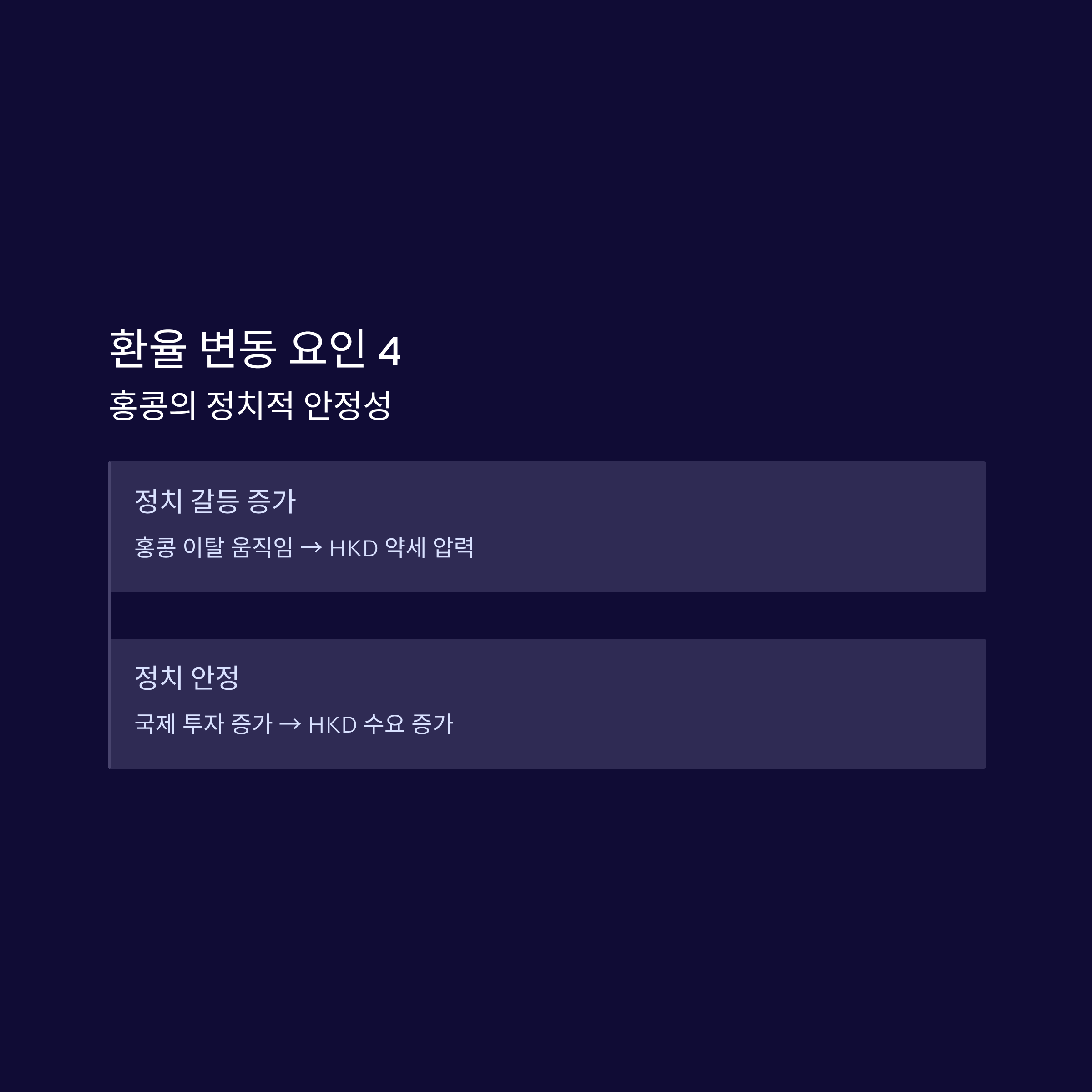 2) 수출 기업: HKD 강세 → 홍콩 시장 진출 유리, HKD 약세 → 불리