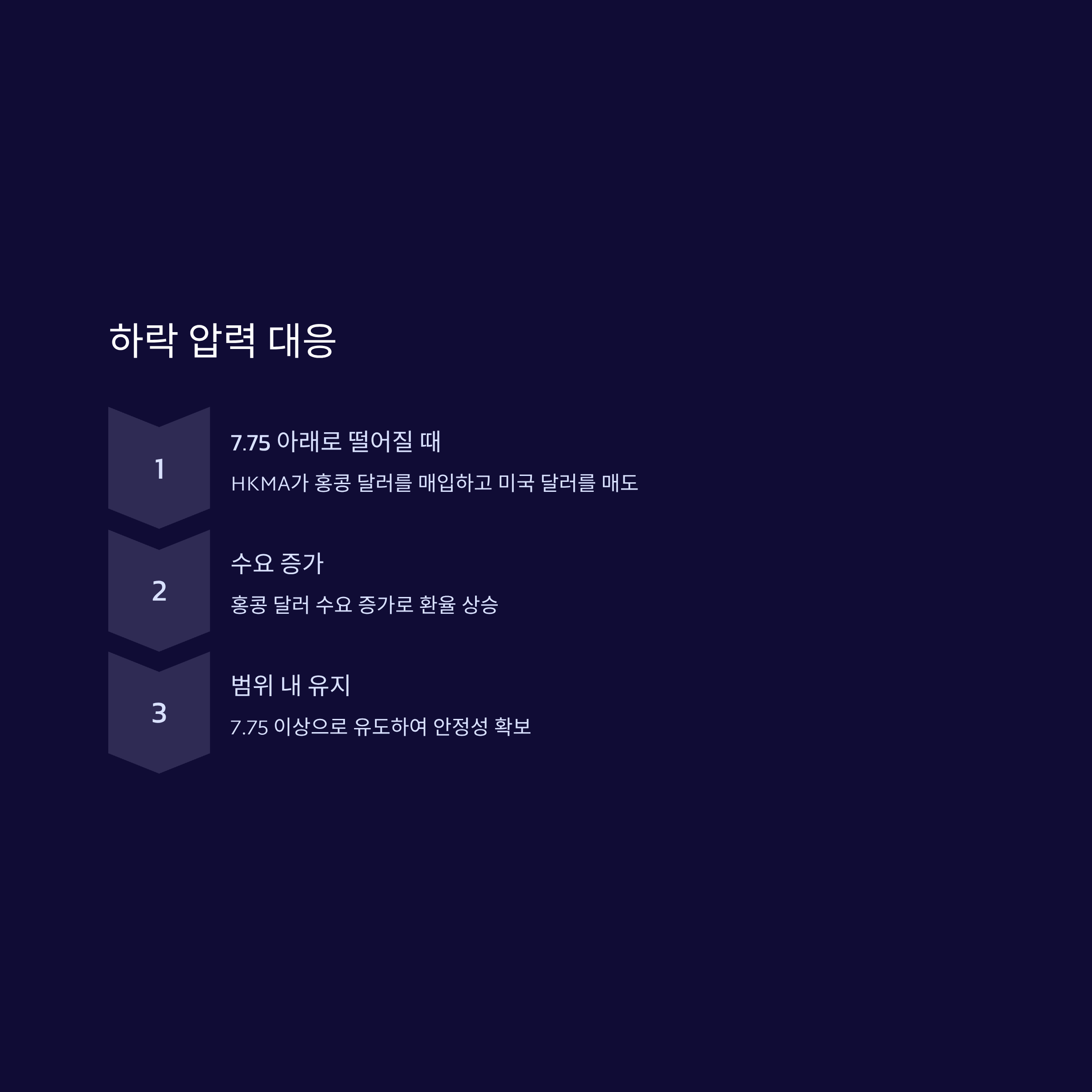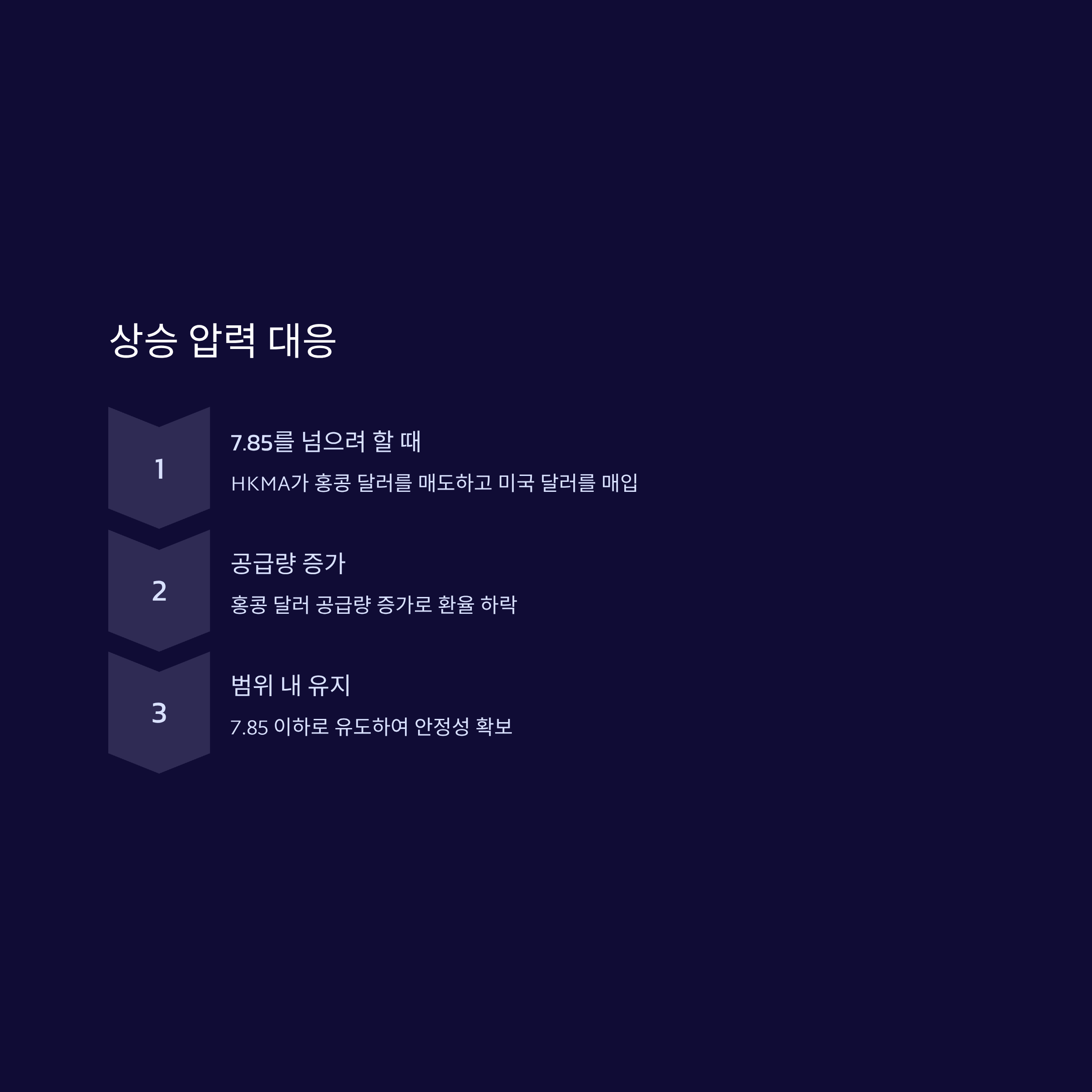 - 홍콩 달러 공급량 증가 → 환율 하락 → 7.85 이하로 유도