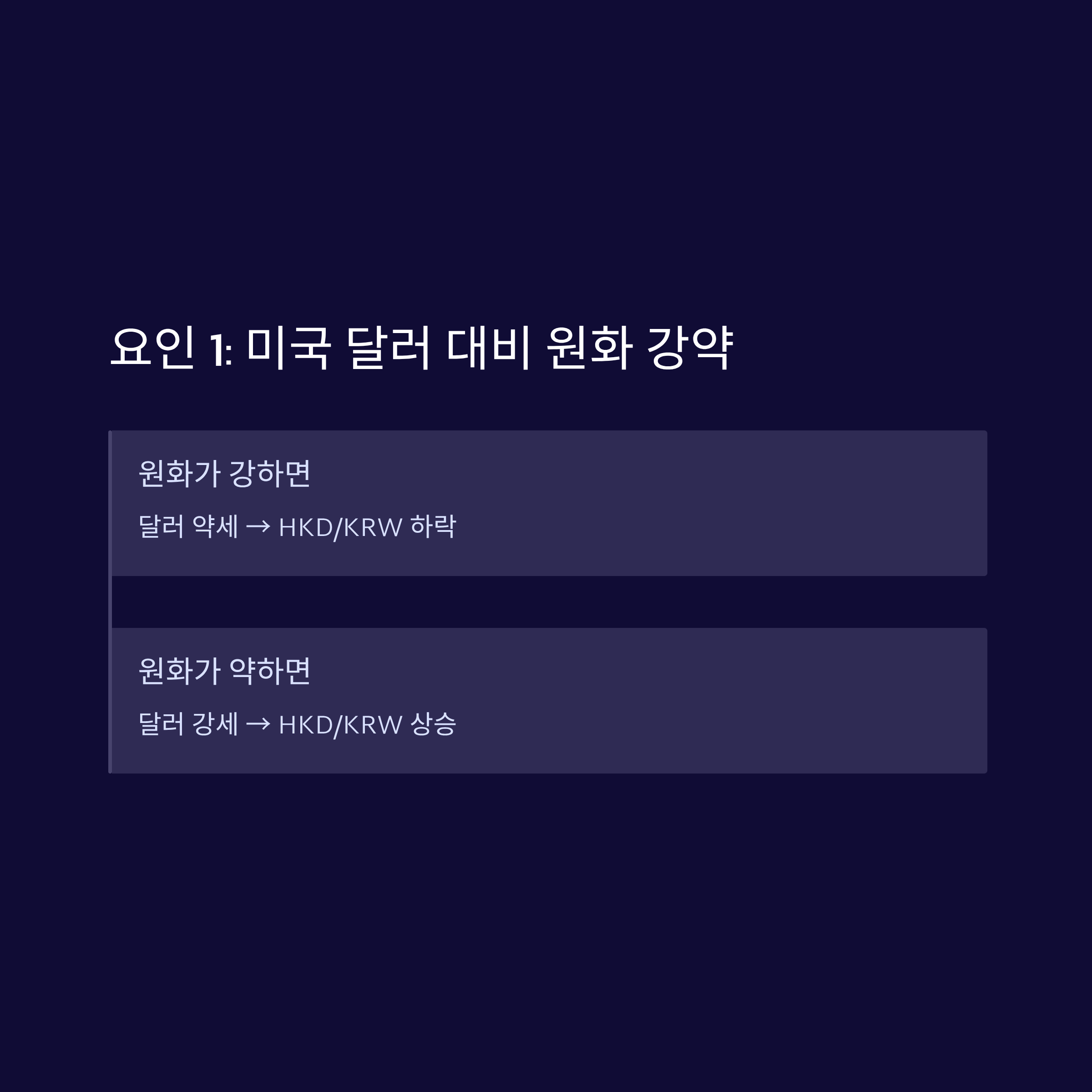 - 원화가 강하면 (달러 약세) → HKD/KRW 하락