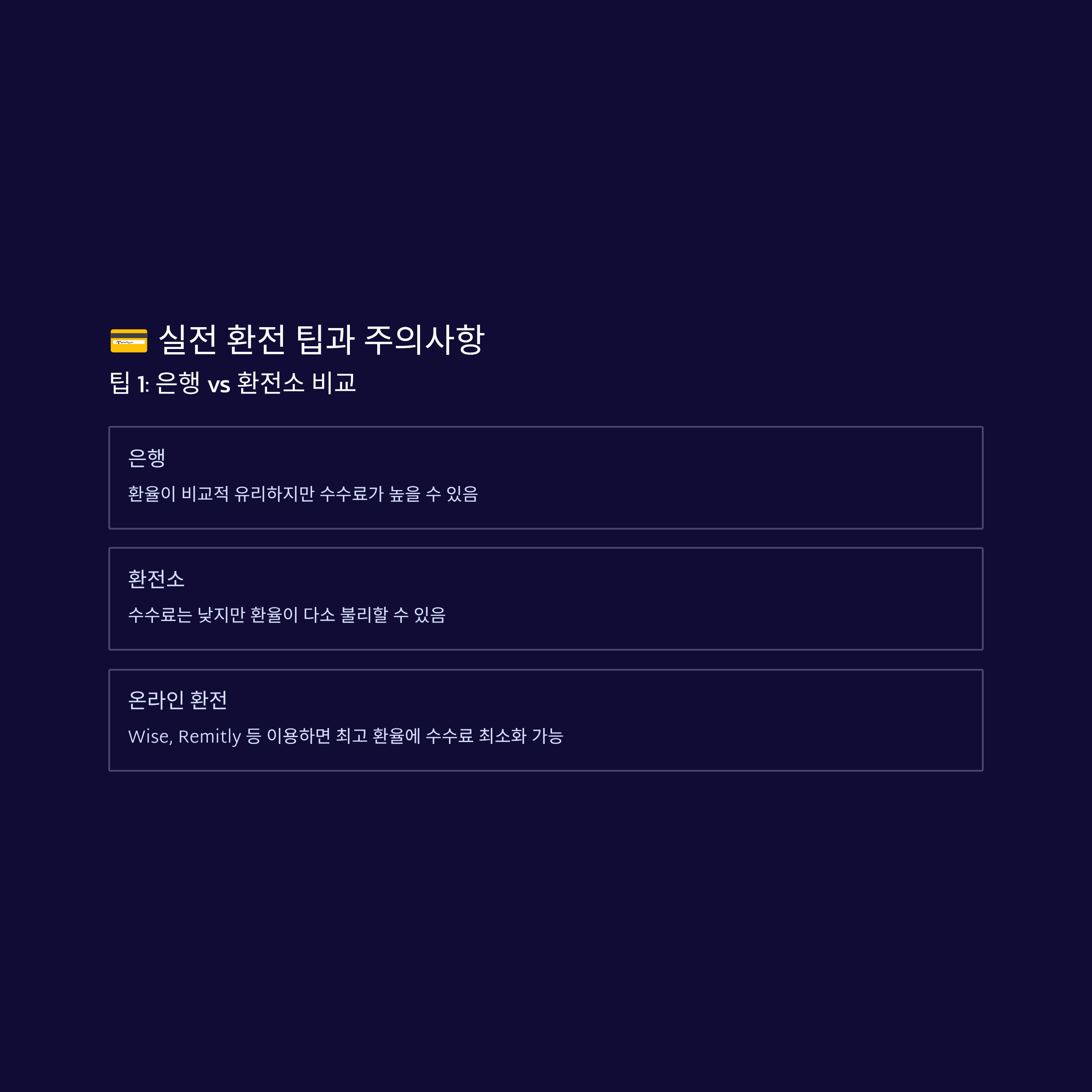 - 은행: 환율이 비교적 유리하지만 수수료가 높을 수 있음