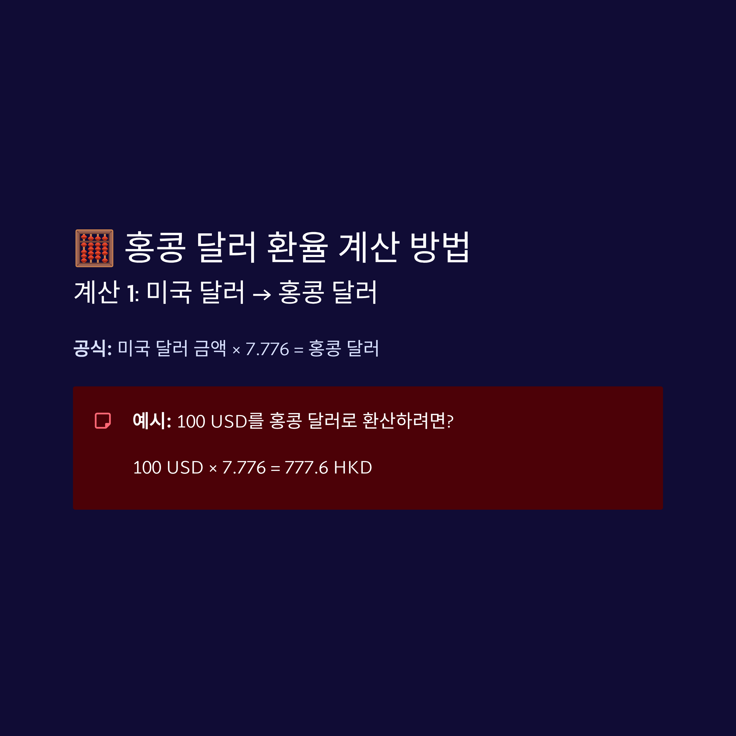 공식: 홍콩 달러 금액 ÷ 7.776 = 미국 달러