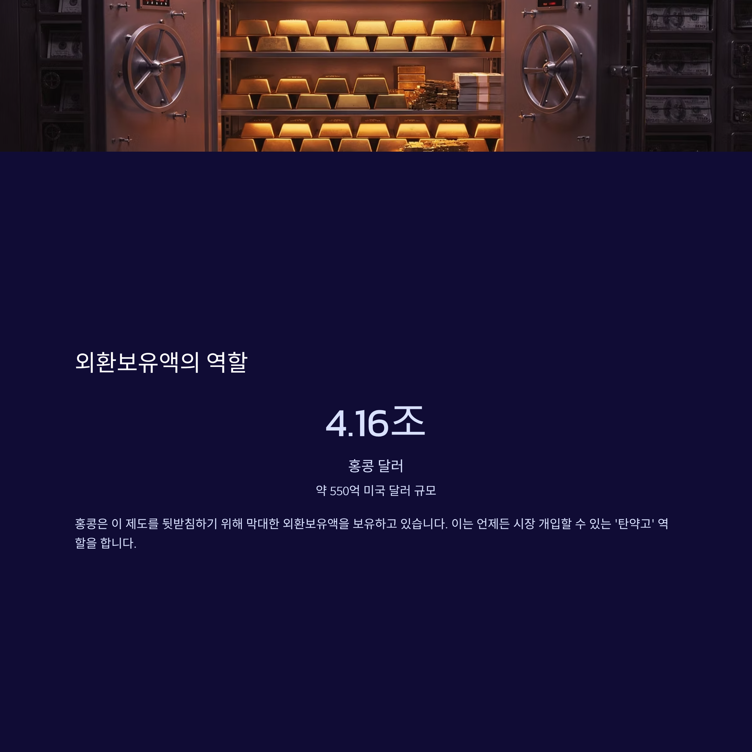 홍콩은 이 제도를 뒷받침하기 위해 약 4조 1,600억 홍콩 달러(약 550억 미국 달러)의 외환보유액을 보유하고 있습니다. 이는 언제든 시장 개입할 수 있는 '탄약고' 역할을 합니다.