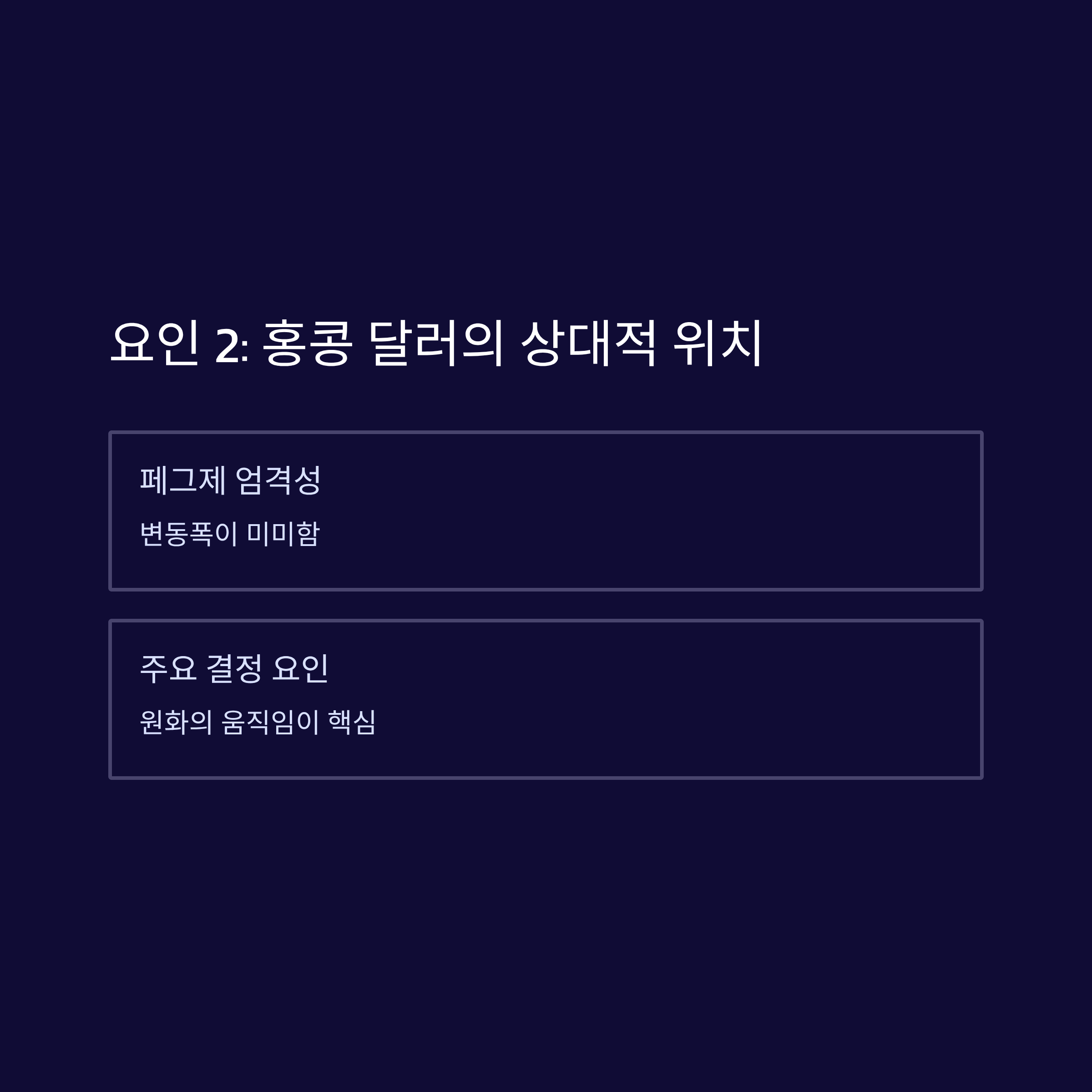 - 중국 경제 부진 → 홍콩 자본 유출 → HKD 약세