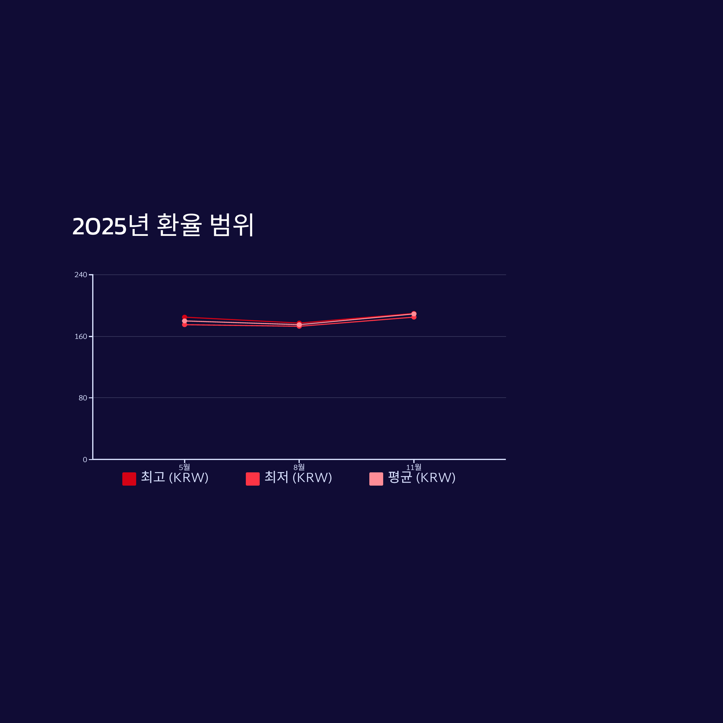 2025년 중반(5월) 원화 대비 환율이 185 KRW 선을 기록했다가, 8월에 173 KRW까지 하락했습니다. 최근에는 다시 189 KRW 수준으로 회복 중입니다.