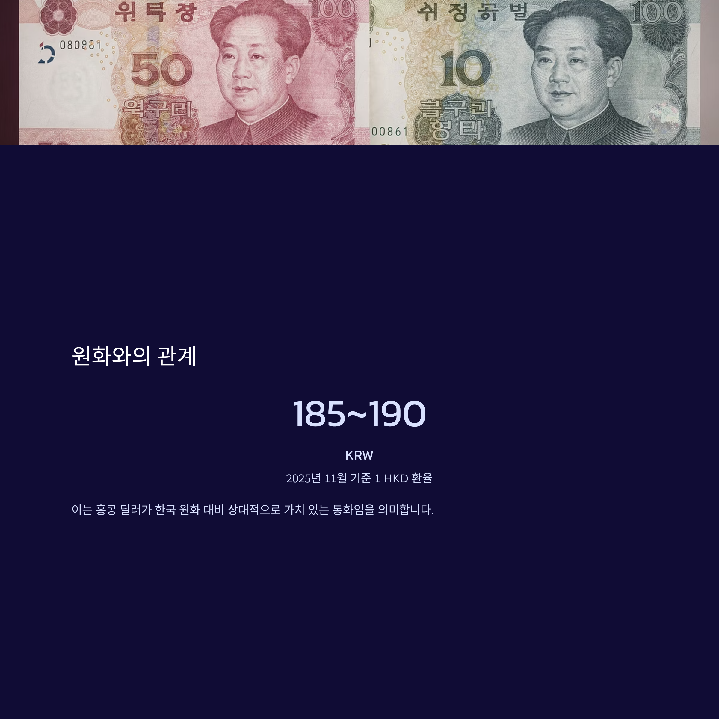 2025년 11월 기준으로 1 HKD = 약 185~190 KRW대에서 거래되고 있습니다. 이는 홍콩 달러가 한국 원화 대비 상대적으로 가치 있는 통화임을 의미합니다.