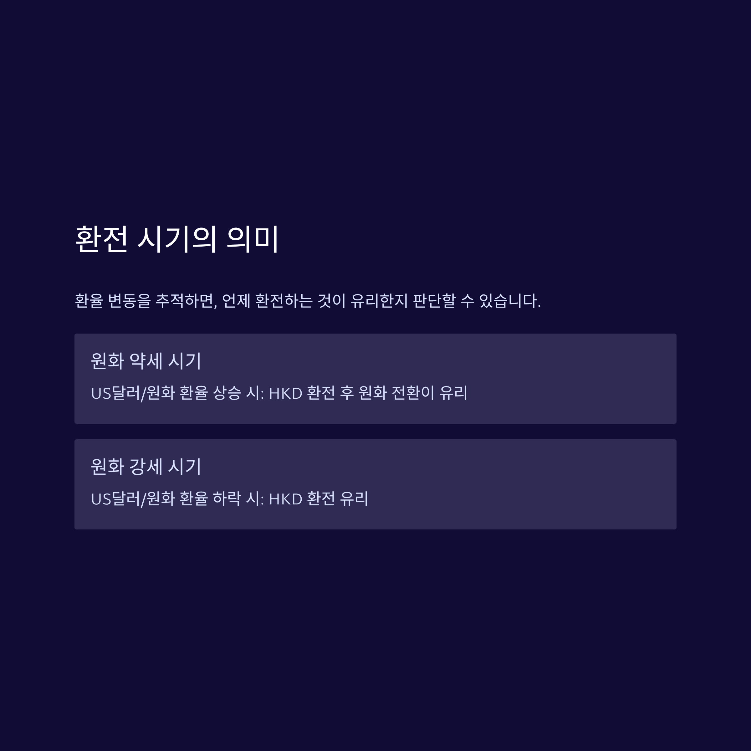 - 원화 강세 시기(US달러/원화 환율 하락 시): HKD 환전 유리