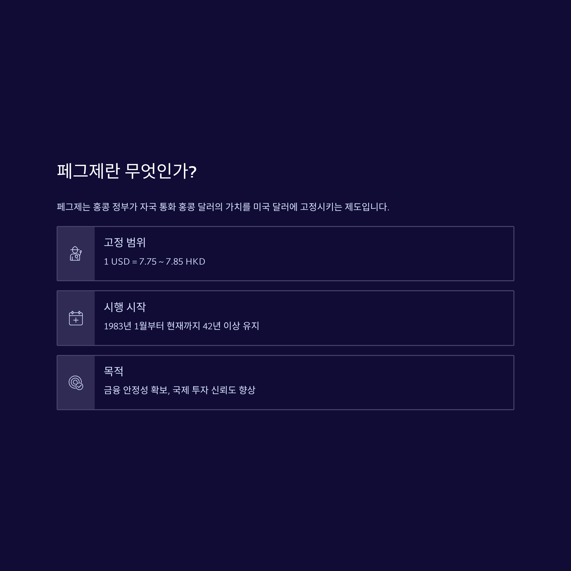 - 고정 범위: 1 USD = 7.75 ~ 7.85 HKD