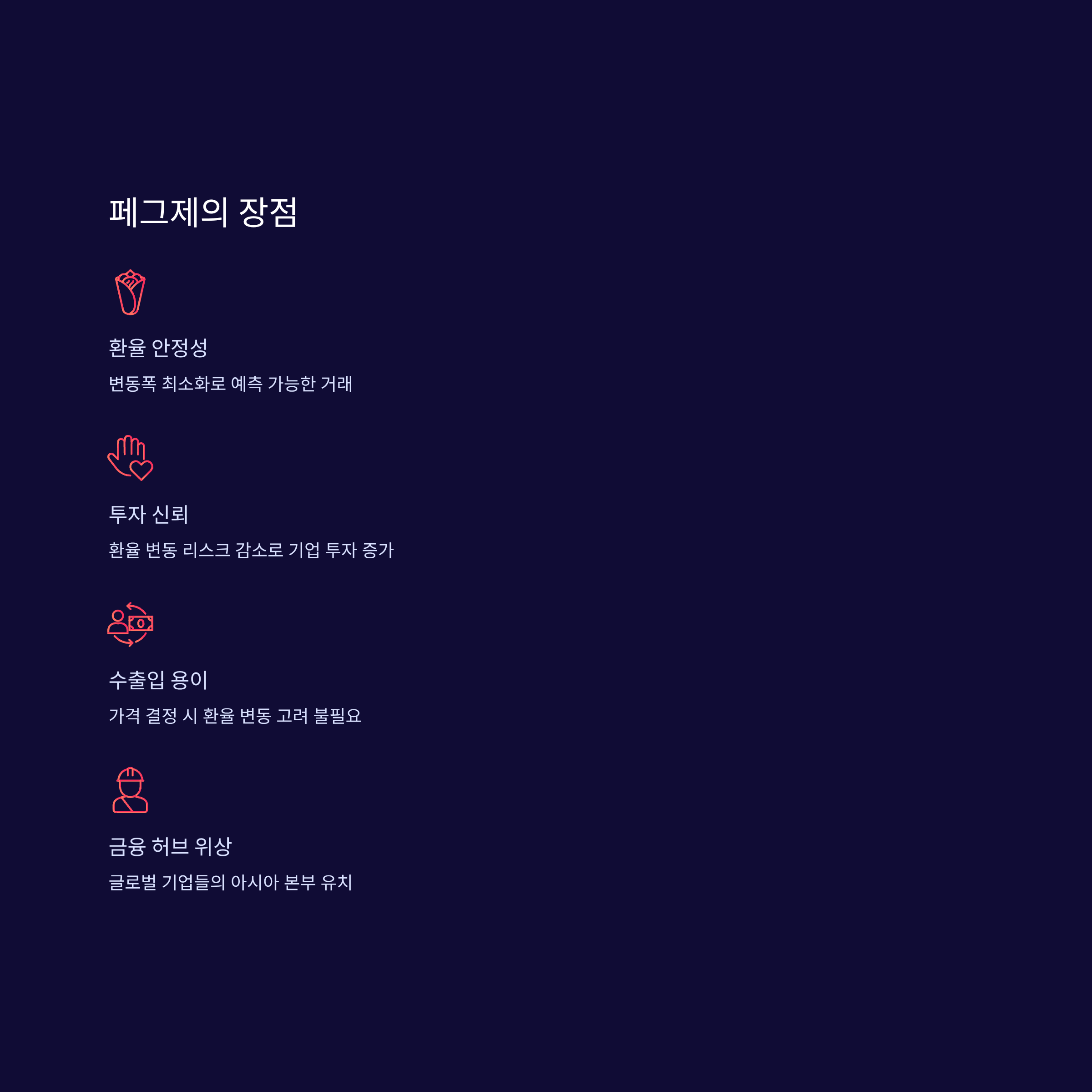 - 환율 안정성: 변동폭 최소화로 예측 가능한 거래